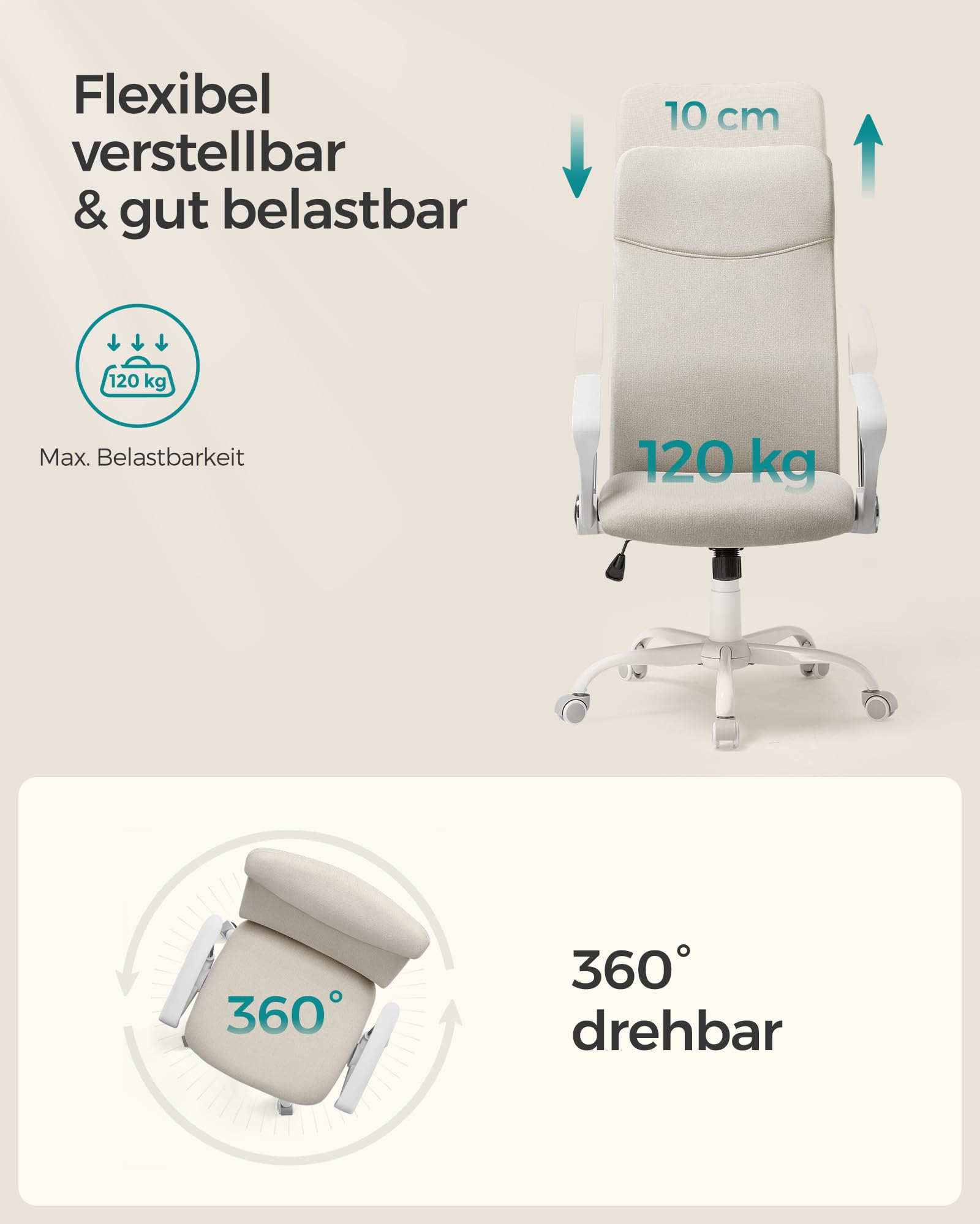 SONGMICS office chair, ergonomic desk chair, swivel chair, padded seat, height adjustable and tiltable, up to 120 kg load capacity, cappuccino beige OBN034K01