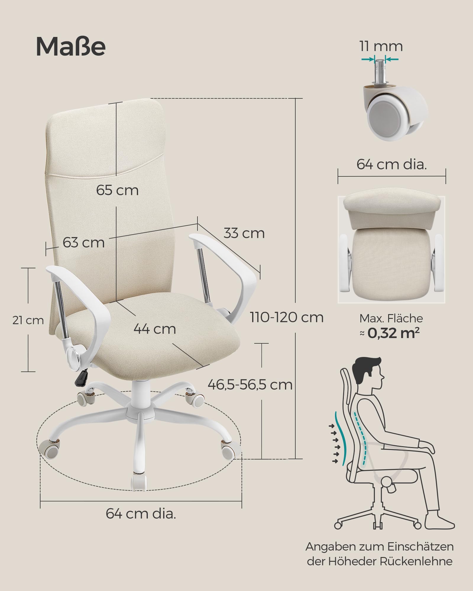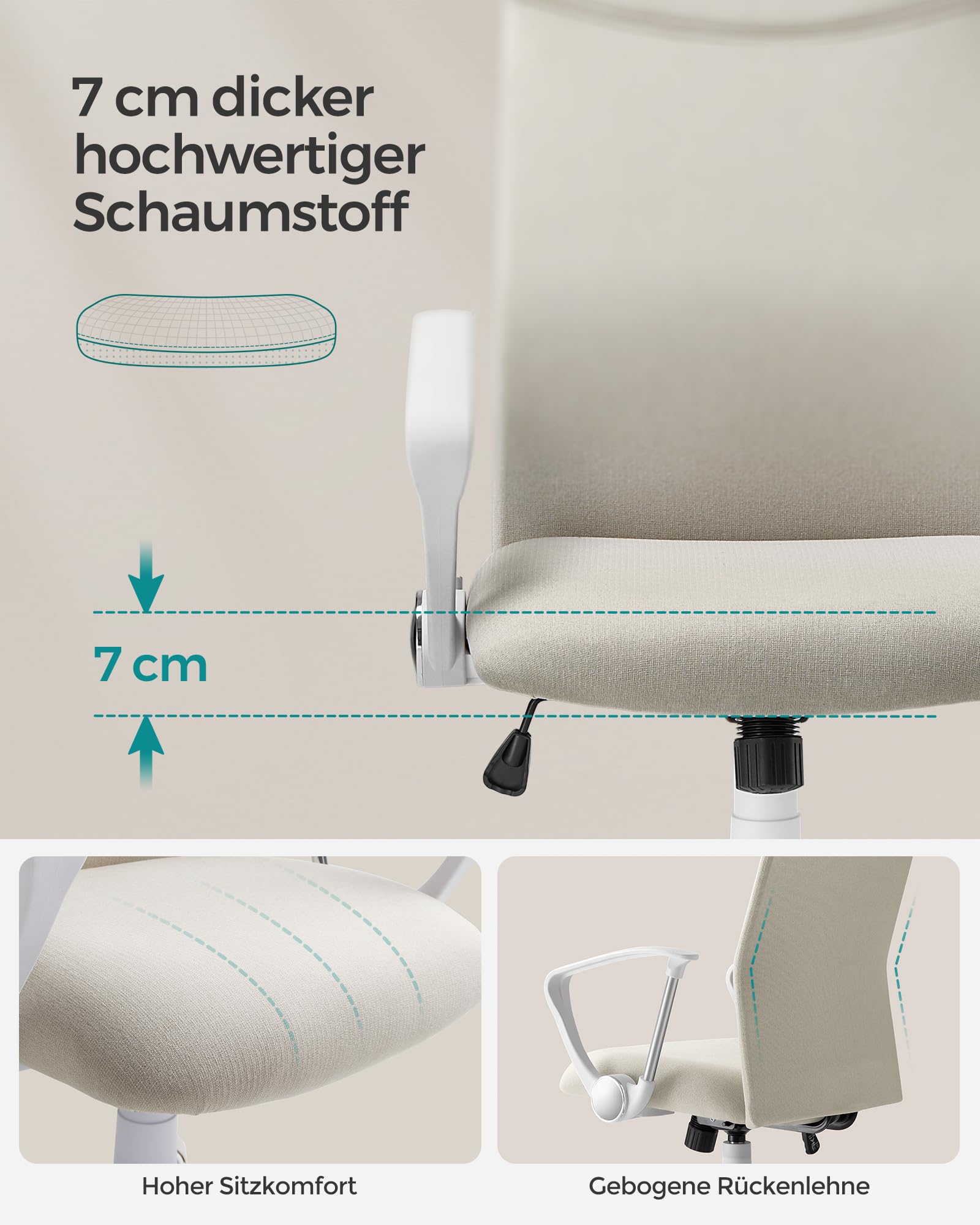 ["Ergonomic backrest"] S-shaped backrest that hugs your body and protects your neck, back, and lumbar area; 90-105° tilt function for more body relaxation. ["Comfortable seating"] 7 cm thick high-quality foam, not too soft, not too firm, relieves pressure during long sitting periods; the high-quality fabric is comfortable and breathable, allowing your body to "breathe." ["Stylish look"] With its minimalist design and classic colors, this office chair is stylish, versatile, and easily integrates into your home. ["High quality"] Thanks to the premium gas lift cylinder and sturdy mechanical base plate, this swivel chair is stable and can support up to 120 kg. ["Effortless assembly"] We provide you with clear instructions and labeled parts to quickly and effortlessly assemble this computer chair.