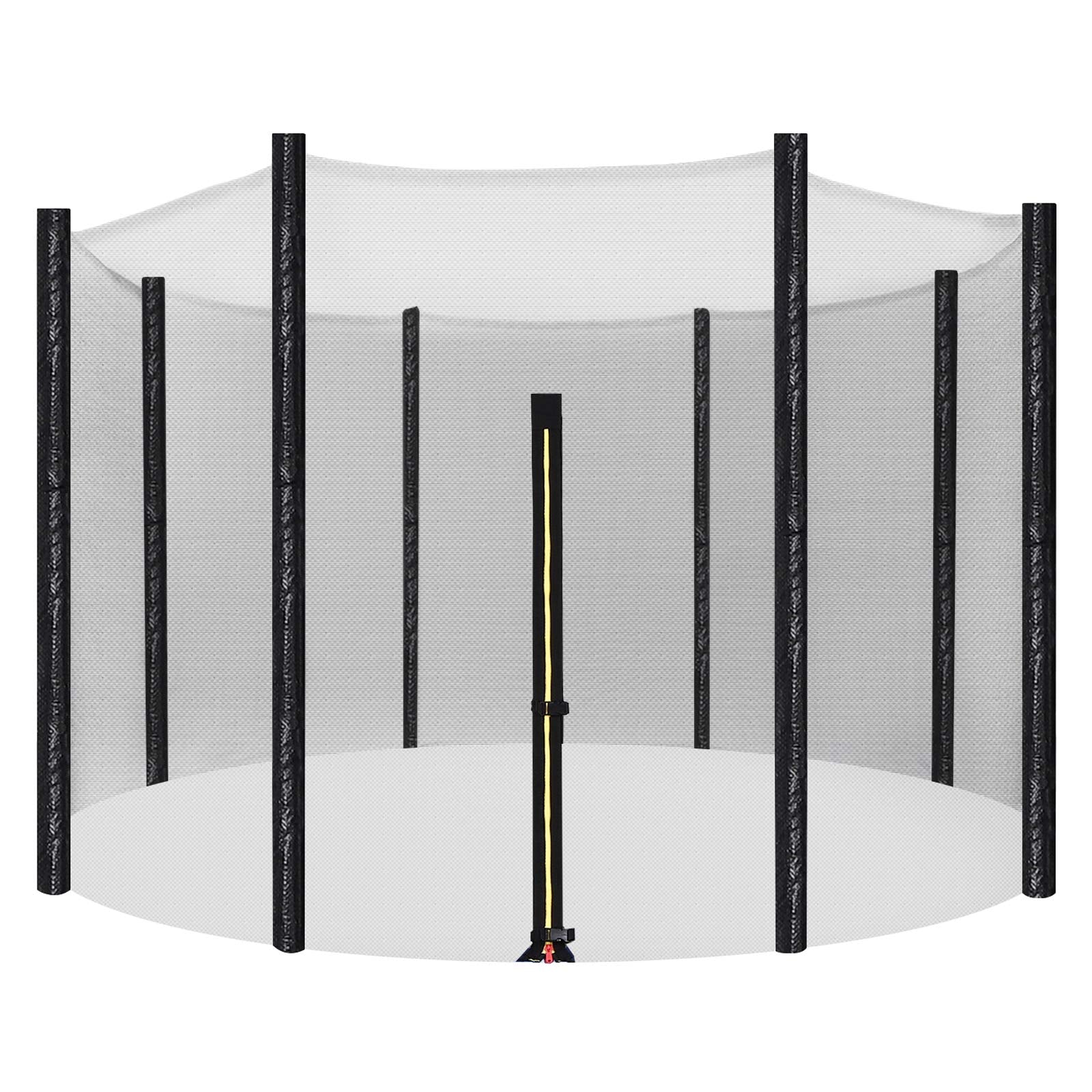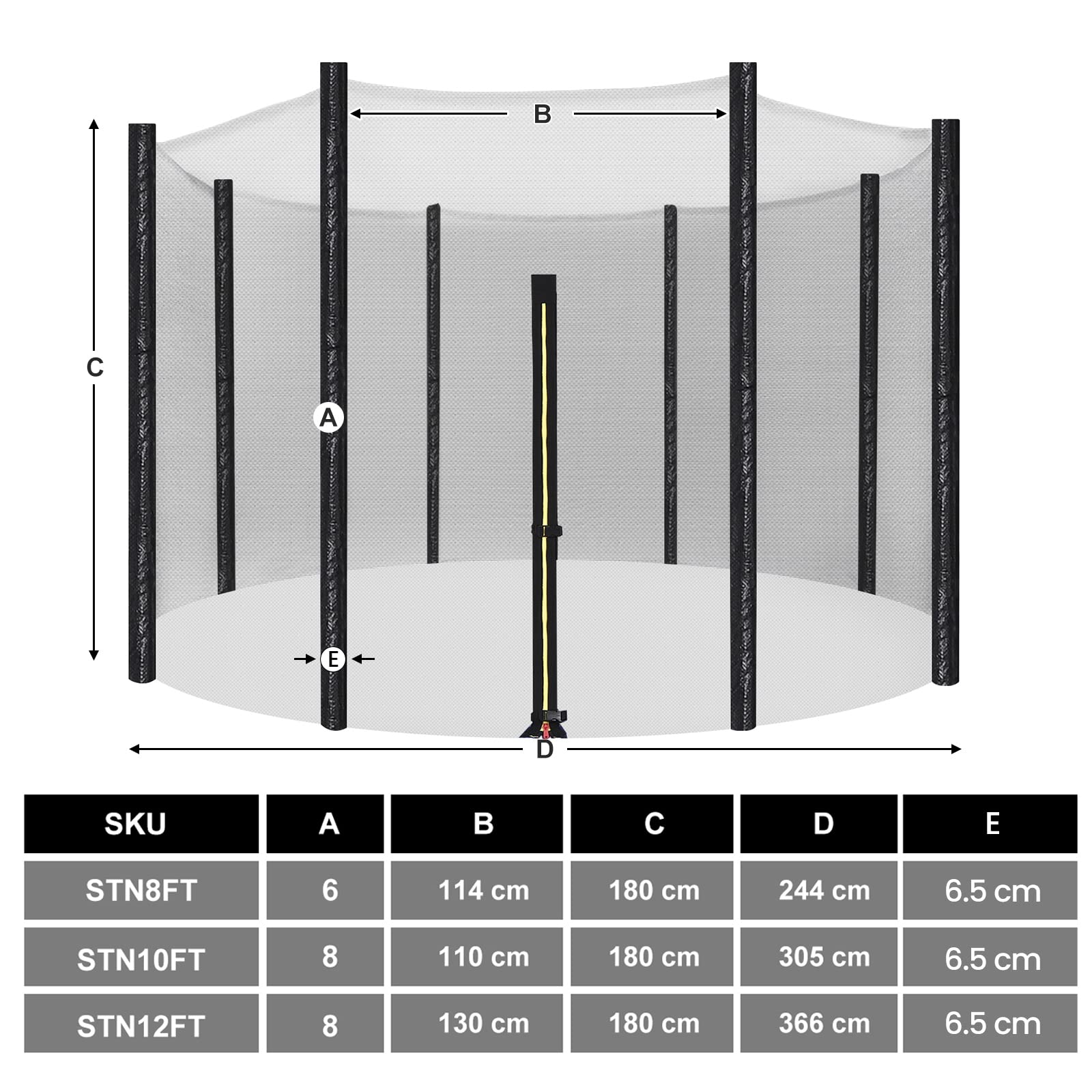["Suitable Trampolines] This replacement net is for trampolines with a 12 ft diameter, 8 straight posts with a height of 5.9 ft, and post diameter less than 2.6 inches.", "[Please Measure] Check your trampoline's diameter, number of posts, height, and diameter to ensure this safety net fits perfectly.", "[Premium Materials] Our replacement trampoline net is made of 120 g/m² dense PE mesh for added safety. Protective sleeves are made of durable PE and a bright yellow zipper on both sides for easy access.", "[Good Craftsmanship] Quality is our top priority, so this safety net is designed with fine and detailed stitching for lasting enjoyment.", "[SVP Safety] To prevent injuries and ensure everyone's safety, it's important to replace your trampoline net when worn or damaged for peace of mind."]