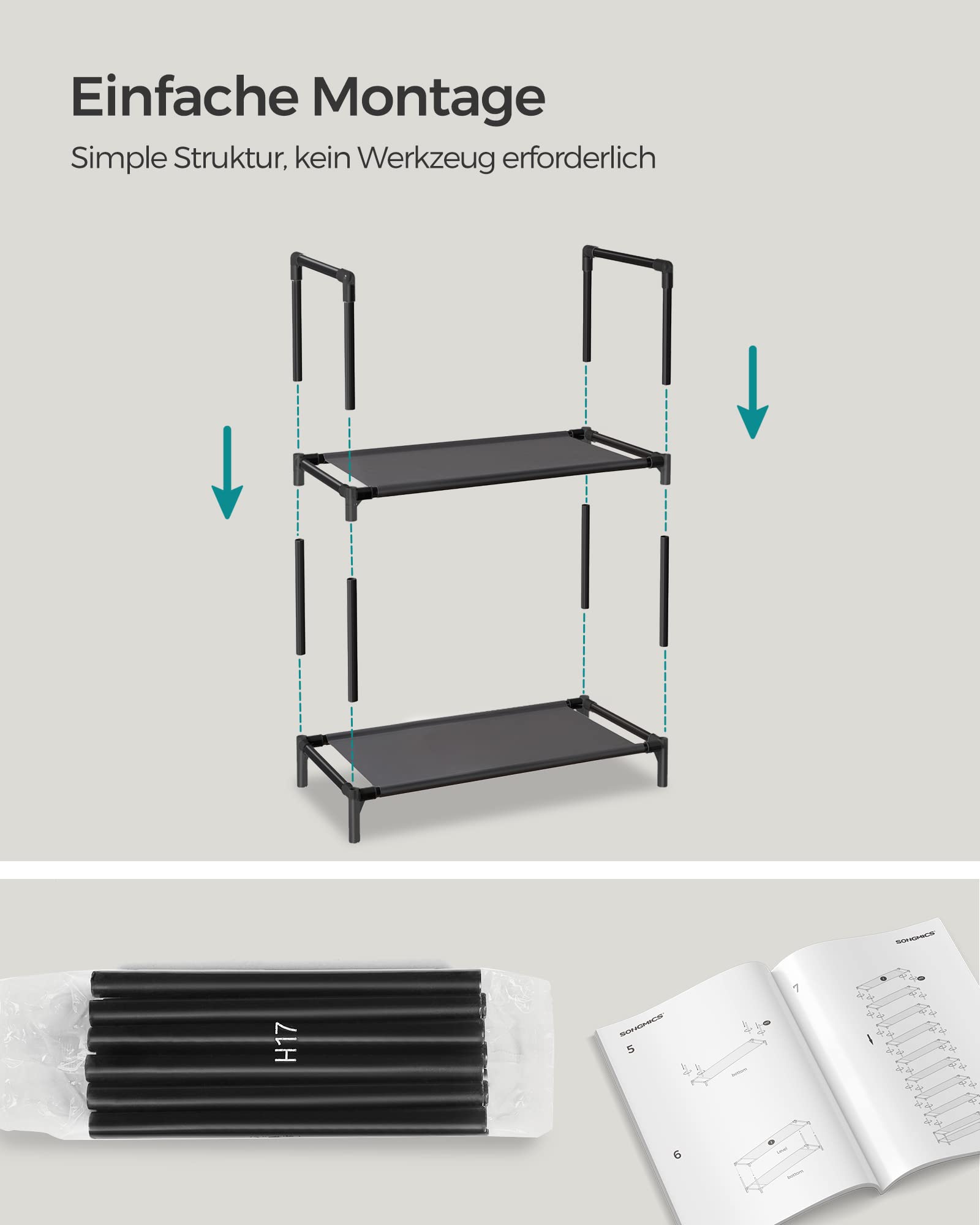 "A stable home for your shoes: This shoe rack is made of durable metal frame and sturdy non-woven fabric shelves. It is characterized by high stability and long service life.",