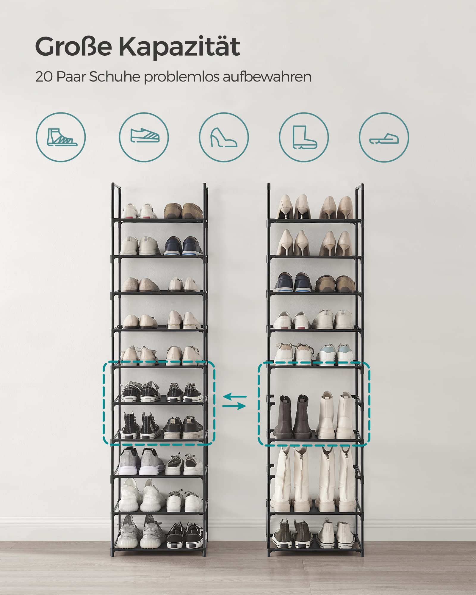 SONGMICS Shoe Rack, 10 Tiers, Shoe Shelf, Shoe Storage, Narrow, 28 x 45 x 173 cm, Metal Frame, Shelves with Non-Woven Fabric, for Entryway, Bedroom, Black LSH010B02