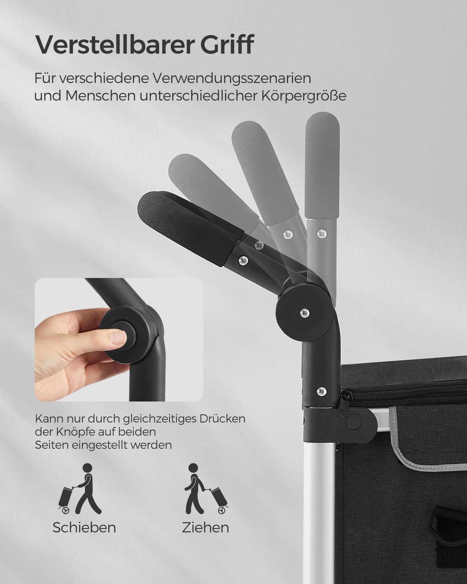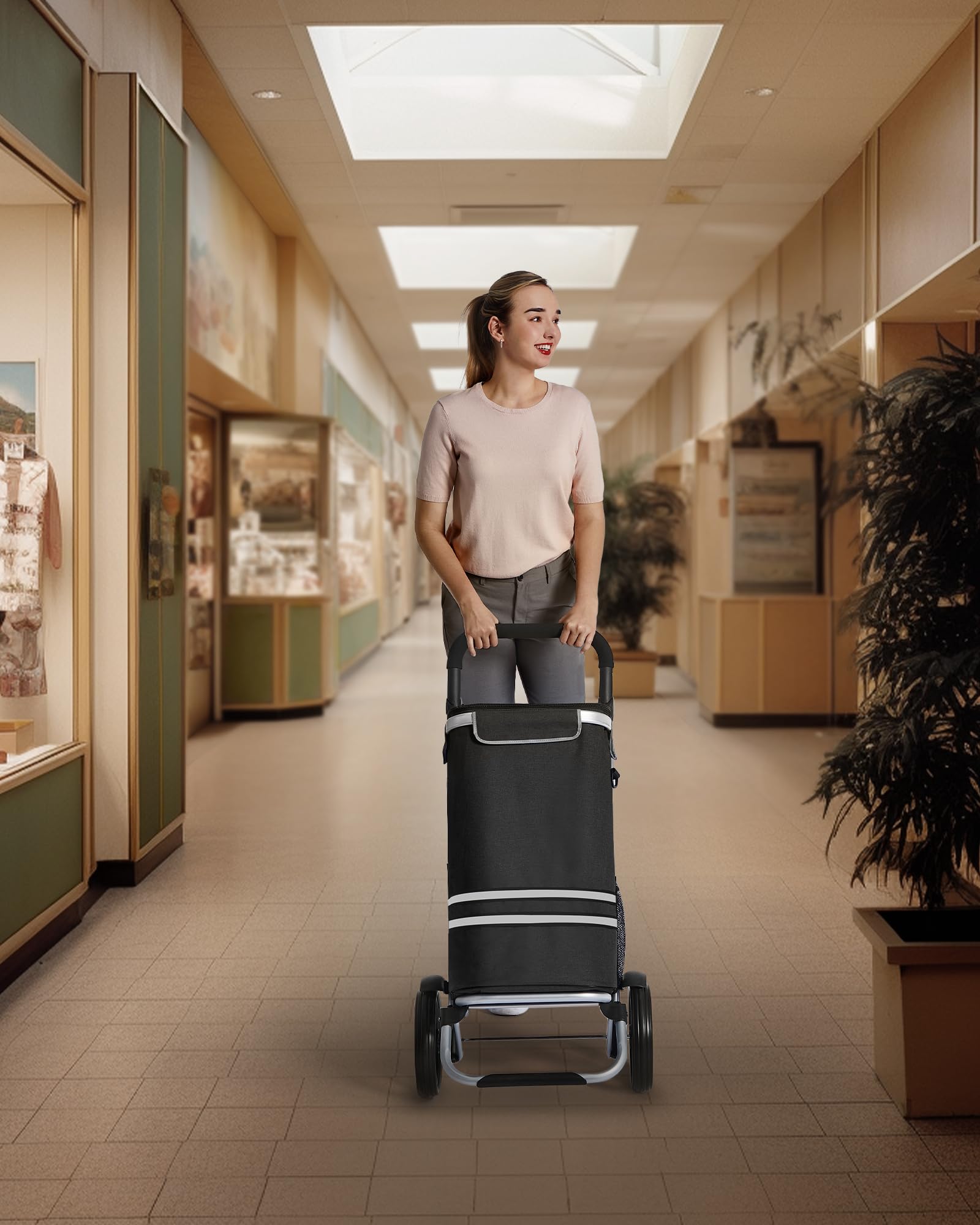 ["Large Capacity] This shopping trolley offers plenty of storage space (35 liters), carries up to 25 kg, and is suitable for weekly shopping.","Additional Storage Space] In the cooler bag inside, you can store chilled foods. The side mesh pockets and storage bag on the back are perfect for your umbrella, keys, and other small items.","Flexible Design] Thanks to the adjustable handle, the trolley can be pulled or pushed and can also adapt to different body sizes. The bag is removable and can be used separately, making it easy to carry with the shoulder strap.","Suitable for Different Road Surfaces] The shopping cart is equipped with 2 large, wear-resistant wheels and can roll smoothly on various surfaces, such as gravel roads, concrete roads, or grass.","Thoughtful Details] Thanks to the practical hooks, you can easily hang the trolley on the shopping cart in the supermarket. The shopping bag is made of water-resistant polyester fabric and is easy to clean"]