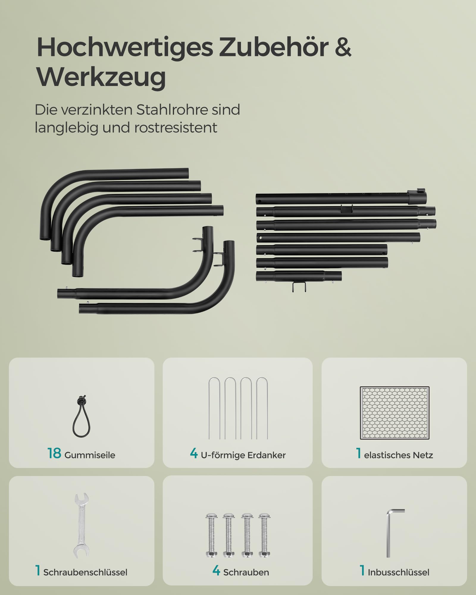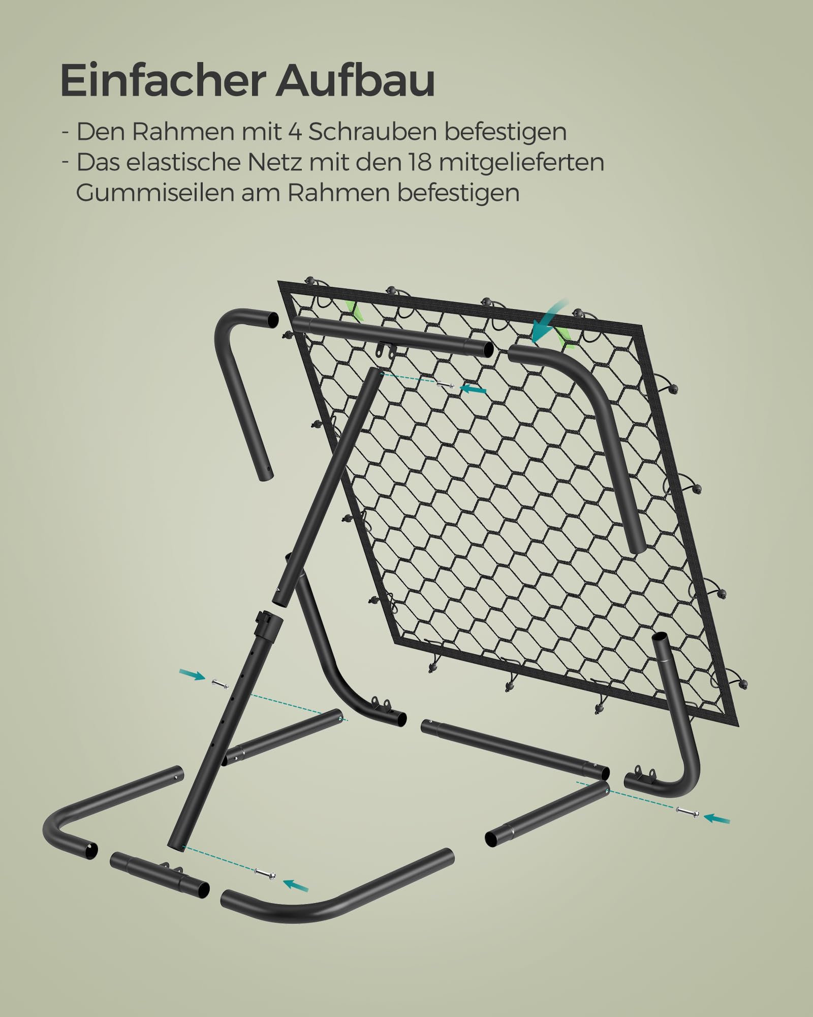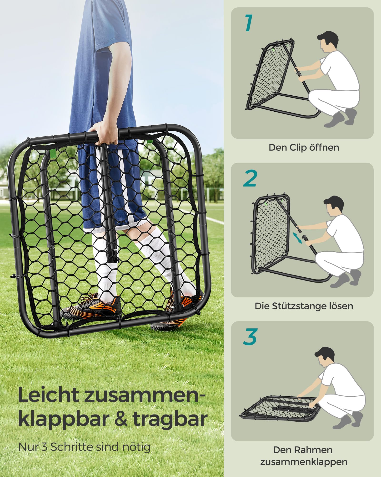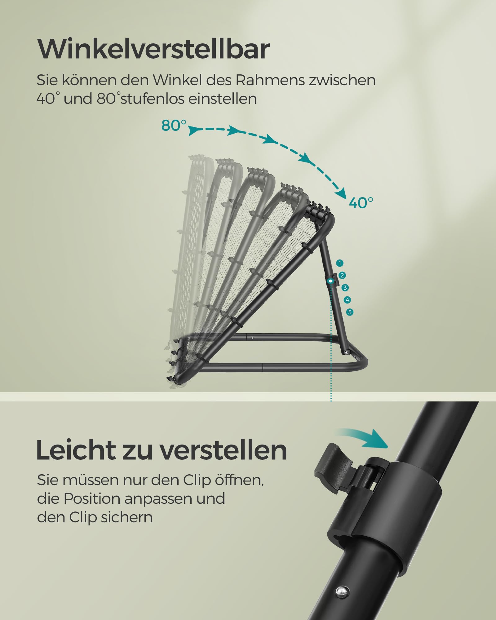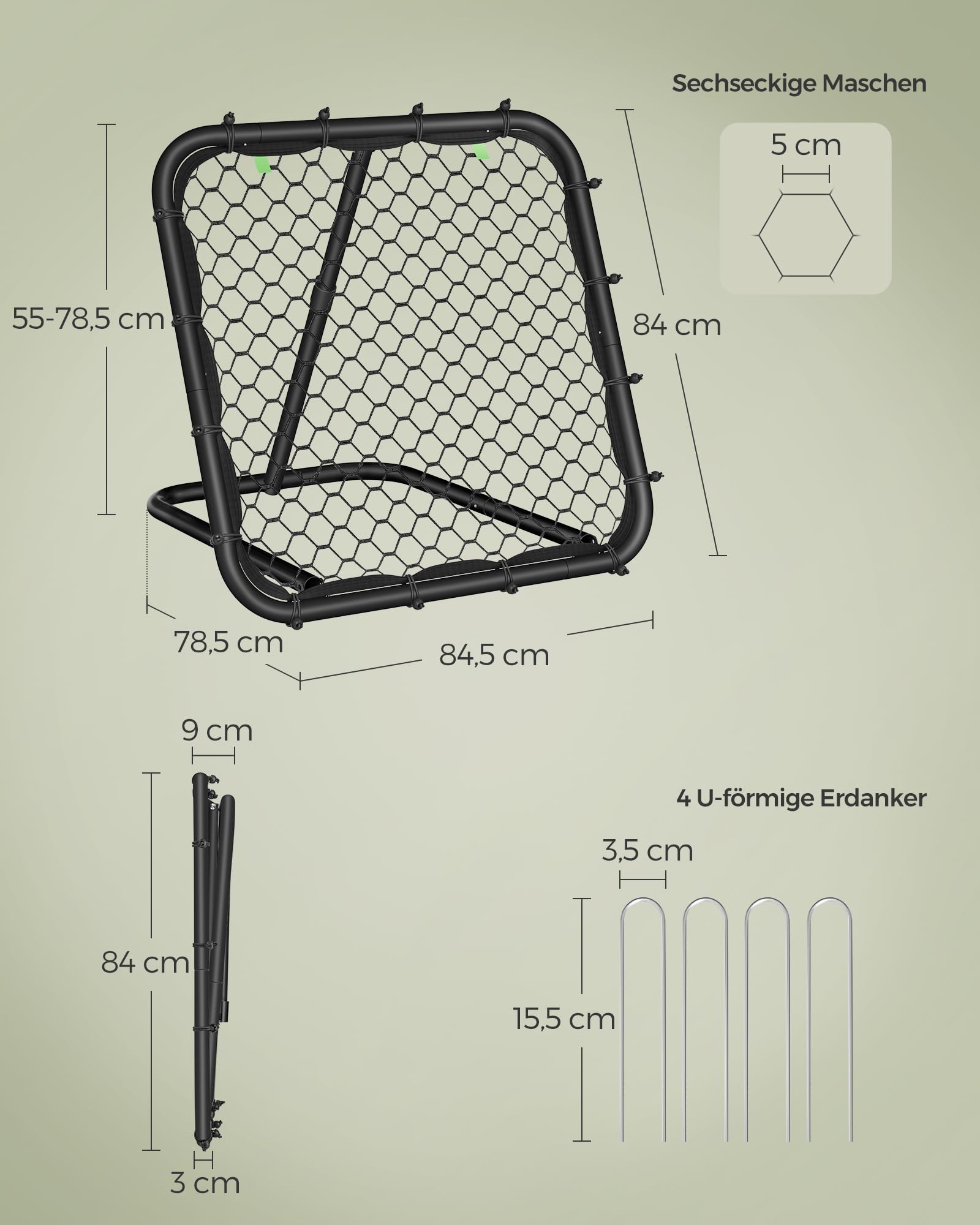 ["Robust & stable] Reinforced steel tubes (1.2mm thick) are durable; the net with hexagonal mesh is more robust than with square mesh; the 4 U-shaped ground anchors provide high stability, even when your child shoots with full force","[Angle adjustable] The soccer goal is continuously adjustable between 40° and 80° (including 5 commonly used angles) to meet your different needs. Perfect for diving training, ball control training, catching training, etc","[Easy to fold & portable] Open the clip to release the support rod, and simply fold the soccer rebounder for easy transport. This way, your kids can play soccer anywhere","[Easy assembly] Secure the frame with 4 screws, connect the elastic net with the 18 included rubber ropes to the frame, and secure the U-shaped ground anchors in the ground - saving you time and effort!","[What you get] A soccer rebounder with 18 rubber ropes, 4 U-shaped ground anchors, 1 elastic net, 1 screwdriver, 4 screws, and 1 hex key. Immediately after assembly, dare to have a little soccer match with your children - Olé, olé!"]