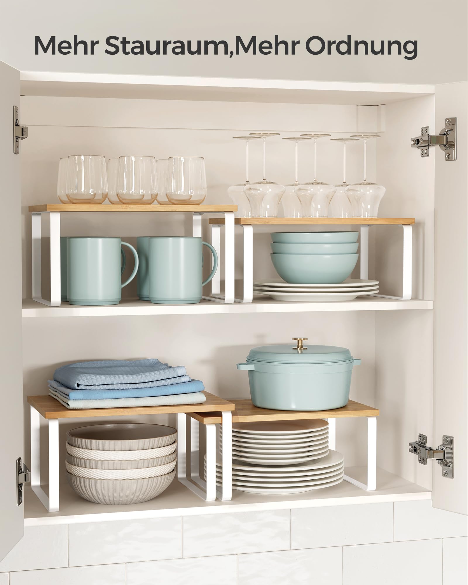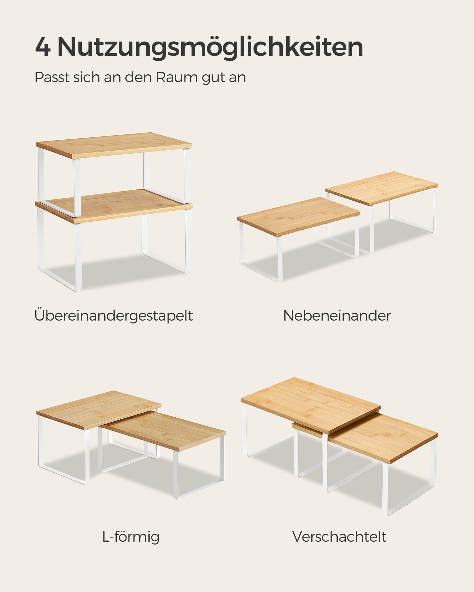 ["Flexible use"] These variously sized cabinet organizers can be stacked on top of each other, nested inside each other, combined in an L-shape, or used separately. Place them where you need additional storage space.