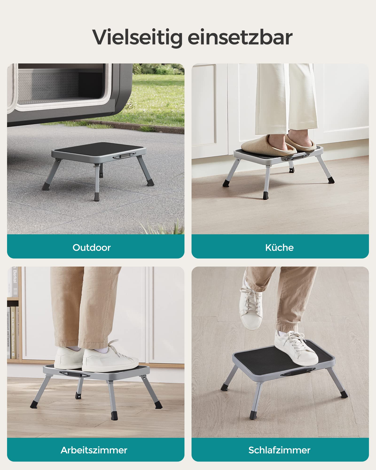 ["Space-saving and easy to carry. Folded down to just 4 cm slim, it can be stored even in corners, drawers, or gaps between walls and cabinets; with a handle, the folding stool (4.2 lbs) is very convenient to transport.","Versatile in use. This step ladder can be used as a staircase outdoors for caravans, etc.; as a stepping aid indoors like in the kitchen, in front of a bookshelf; as a support under the office desk for an ideal sitting posture.","Stable & safe. With a 10.2 x 15 inch large standing area, sturdy steel frame, and four outward-facing legs, the ladder provides high stability and prevents tipping under load; folding lock secured with safety buttons/spring buttons.","Non-slip feet & floor protection. The tread surface has ribbed anti-slip mats that ensure a secure and firm grip; the feet are equipped with rubber caps to protect your floor from scratches.","What you get. A folding ladder with a steel frame, which can hold up to 330 lbs. So treat yourself to this sturdy ladder with a working height of 6.9 inches and safely access higher places."]