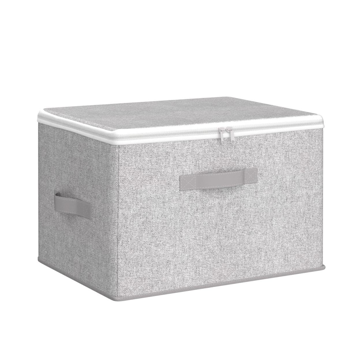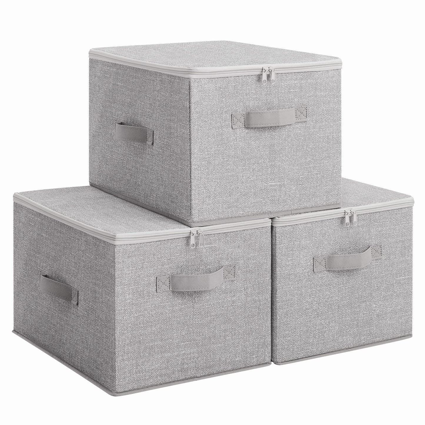 ["【EVERYTHING HAS ITS PLACE】Even after a big cleanup, your closets quickly become chaotic again? But not anymore! Everything from sweaters to baby diapers can be neatly stored in these 3 boxes","【PROTECTIVE COVERS】The lids of these fabric boxes have a zipper running over three sides, protecting your clothes from dust; so feel free to place the boxes on a shelf, on top of the wardrobe, or under the bed","【MORE THAN JUST STORAGE】The linen-like texture of the non-woven fabric and the subtle light gray color bring warmth and calmness to your room","【MORE FLEXIBLE THAN YOU THINK】The 3 handles (one in the front, 2 on the sides) help you easily pull out the boxes and transport them from the living room to the bedroom. They can also be quickly folded and stored to save space","【WHAT YOU GET】3 storage boxes with zipper lids and 3 handles for easy transportation, which can be folded up for storage"]
