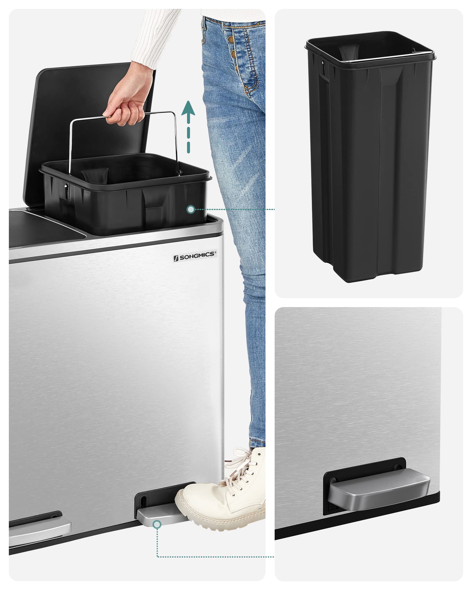 ["A REAL BLESSING FOR YOUR KITCHEN: A trash can doesn't have to look like trash; with its elegant silver color and simple design, this garbage bin from SONGMICS will be a highlight in your kitchen","DONE IN ONE STEP: The step bin is equipped with pedals for easy and hygienic opening, and has 2 inner buckets so you can separate your waste by materials","SHOWS ITS GENTLE SIDE TOO: Despite its tough exterior, this bin also has its gentle sides - The built-in damper closes the lid slowly; the airtight seal keeps you protected from bad odors","FITS PERFECTLY IN ANY CORNER: You can easily place the rectangular trash can, which takes up less space than a round model, in a corner or against a wall. The lid does not interfere when opening","WHAT YOU GET: A 48-liter trash can with 2 compartments, equipped with practical pedals and removable inner buckets. Waste disposal and sorting made easy!"]