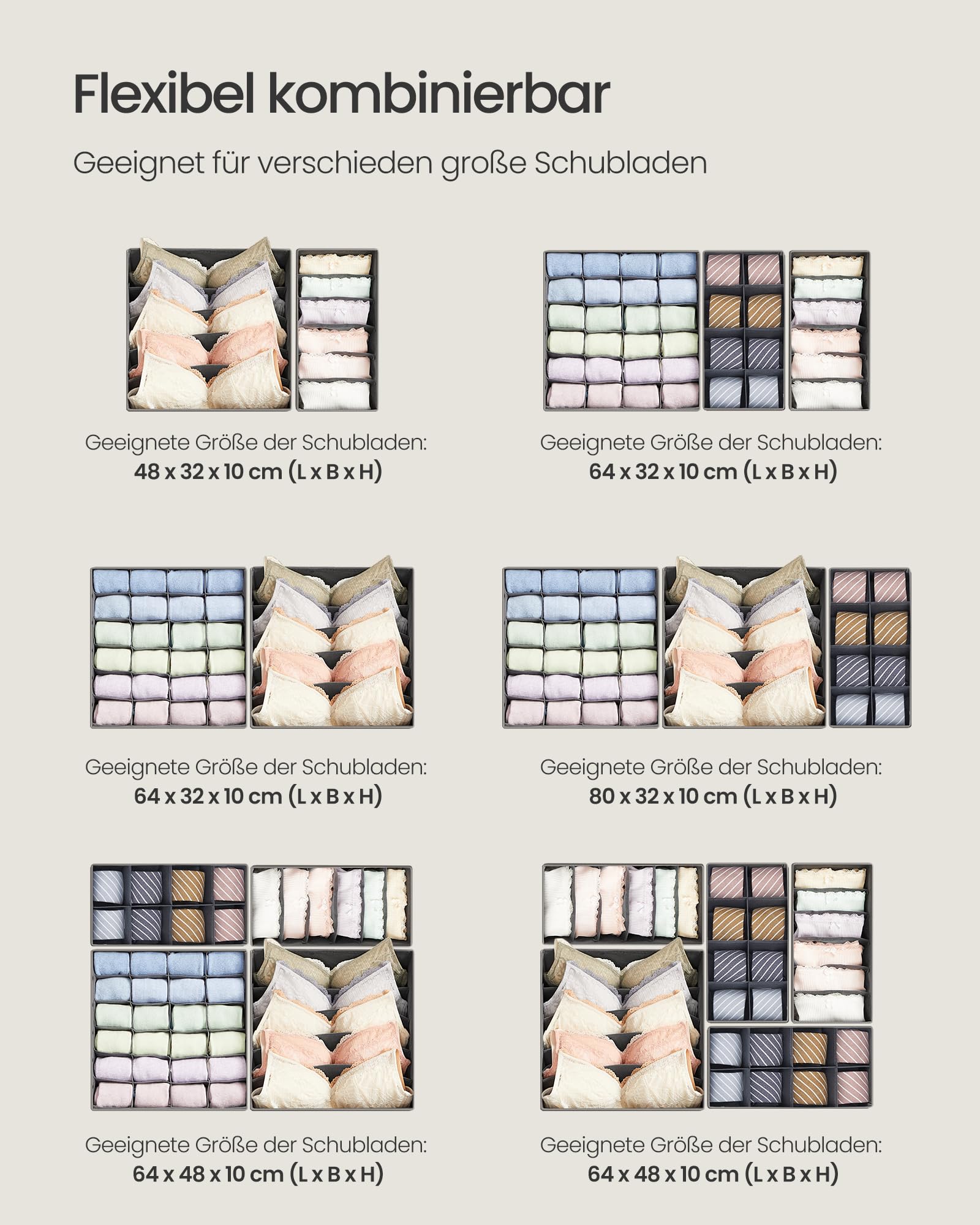 ["Sturdy shape"] The drawer organizers are made of 80 g/m² non-woven fabric supported by cardboard, ensuring they are shape-stable. Fill them with your underwear without worry.