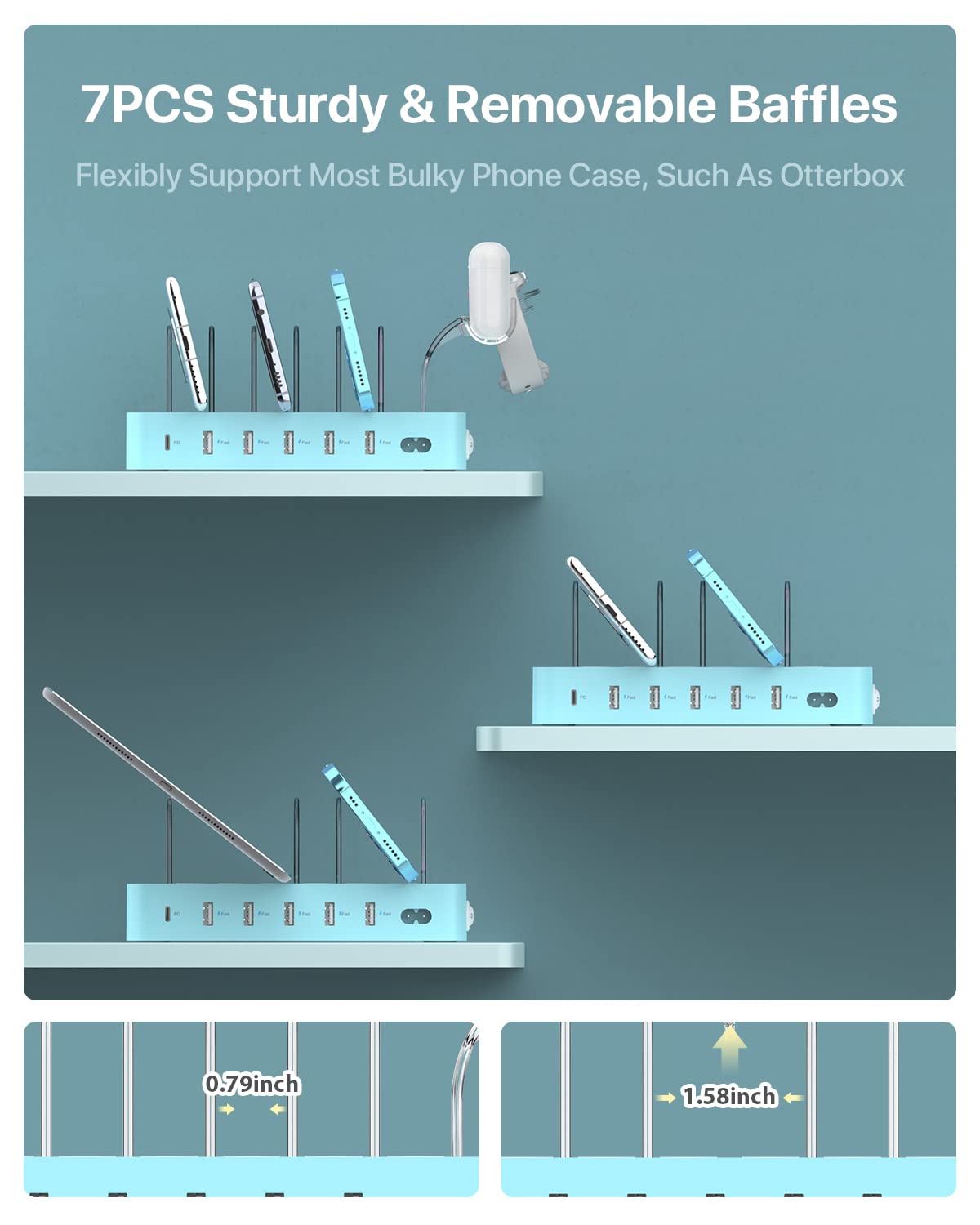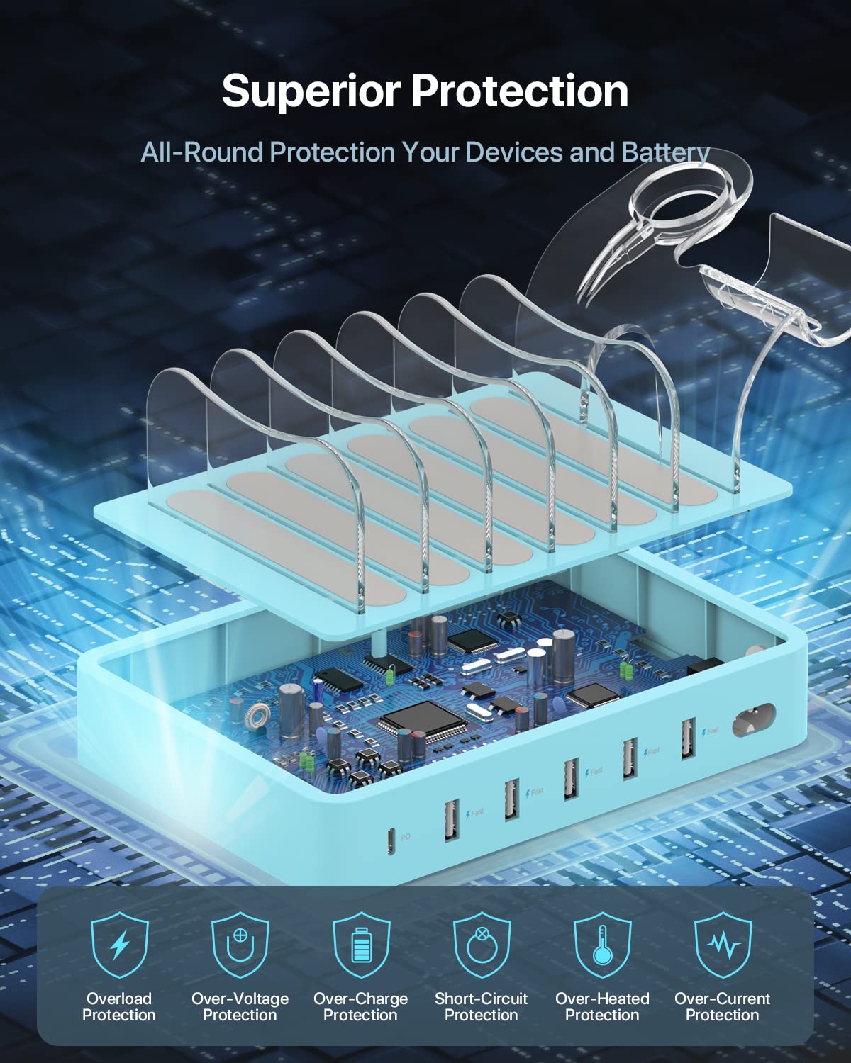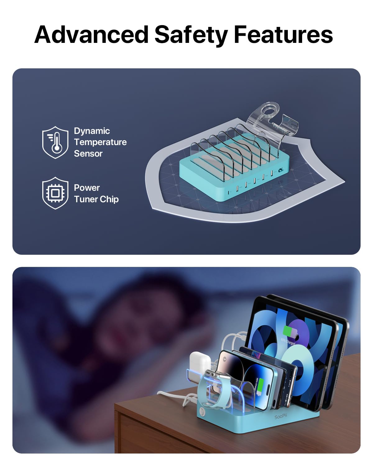 ["60W/12A power and PD 20W – fast charging power 20W combined with SooPii's proprietary PowerAI and voltage boost to charge almost any USB device as quickly as possible. With the 1 Port PD 20W technology, compatible latest iPhones can be charged up to three times faster than traditional chargers and compatible devices can be charged up to 80% in just 30 minutes, for lPhone 14/14 Pro/13 Pro/13/12 and more (i Watch charger not included).","Upgrade 2-in-1 stand – with the new stand for iWatch charger and AirPods, all your phones, iWatch, and AirPods are charged in one place, clean and organized. Perfect for business, office, conference room, home, living room, bedroom, kitchen, hotel, restaurants, and classrooms. (i Watch charger not included).","Charging & clean & organized – no more cable clutter, no pile of chargers, all in one place, clean and organized. White color with durable matte finish, bright blue LED, and Space Gray silicone strips make this charging station a true premium charging station. Designed to fit anywhere: office, meeting room, home, living room, bedroom, kitchen, hotel, restaurants, classrooms.","Advanced safety features – Equipped with our brand new Activeshield security system for enhanced protection. Features a dynamic temperature sensor that actively monitors temperature, and a Power-Tuner chip to adjust power output to protect all connected devices.","What you get in the box: 1 SooPii Premium charging station, 7 strong shields for phones and tablets, 1 2-in-1 diversion plate holder for i Watch charger and AirPods (i Watch charger not included) and a 6-pack of short charging cables (2 compatible with lPhone lPad, 2 Type C, 1 Micro-USB, and 1 USB C to USB C) for daily use, user manual, our worry-free 3-year service, and friendly customer service."]