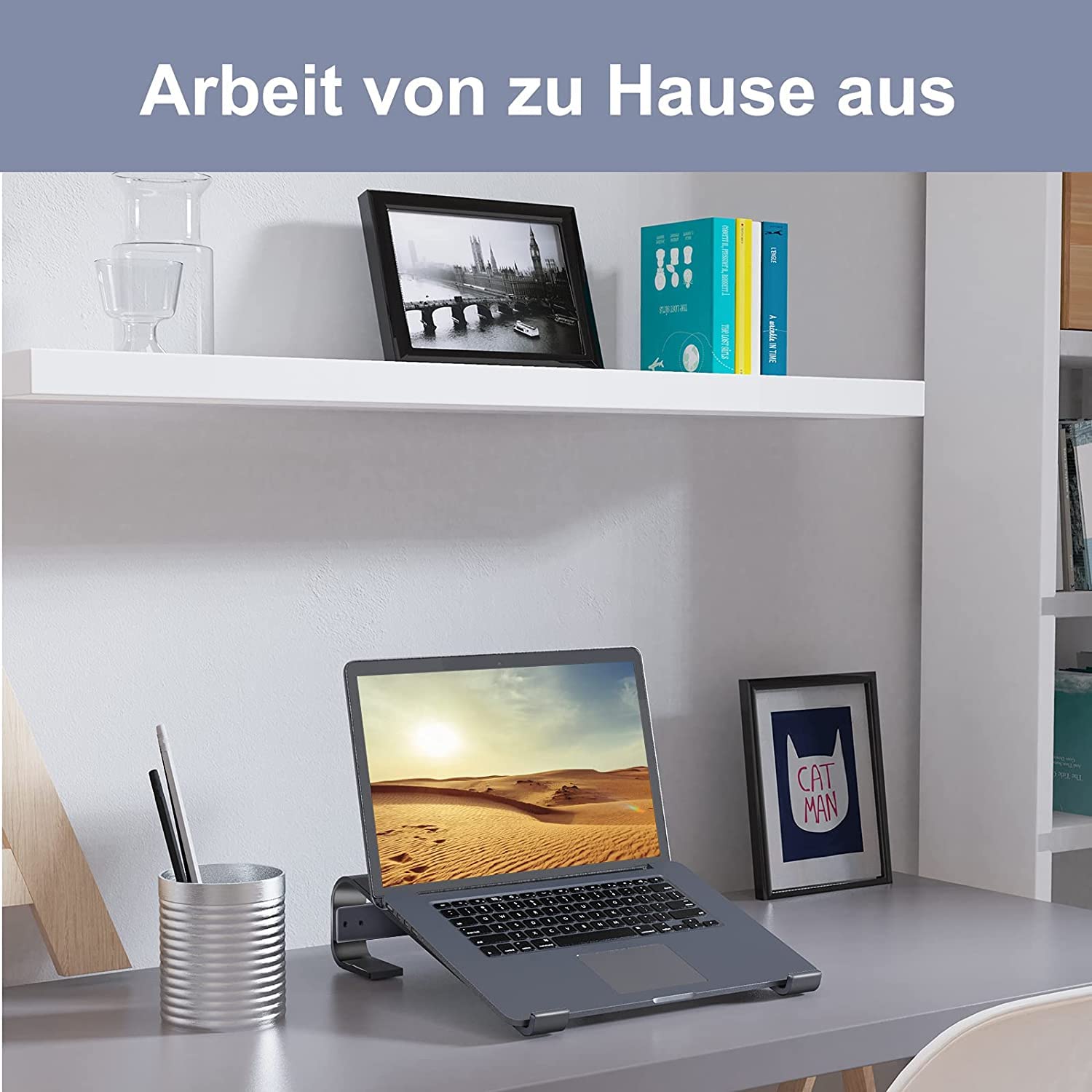 ["Sturdy Aluminum Alloy Super Stability"}This laptop stand is simple. The rubber inlets prevent slipping. The desk laptop stand tilts at a perfect angle to protect your wrist and maintain your neutral posture. The high-quality aluminum hook and the anti-slip rubber pad ensure smooth typing, without worrying about the laptop sliding back and forth or "rocking".