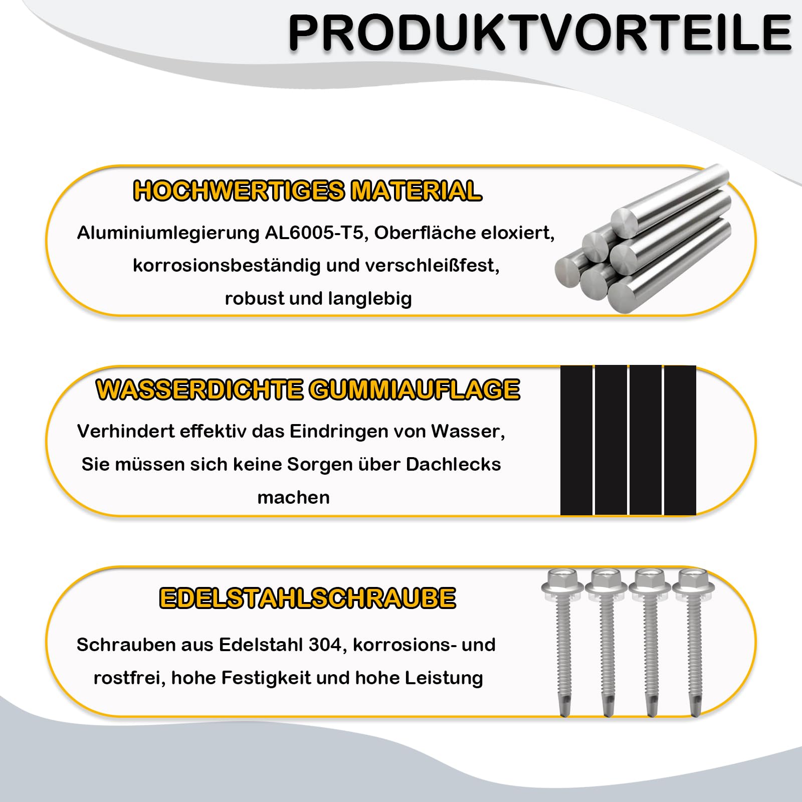 ["HIGHWEARTIGES MATERIAL: This solar mounting installation kit consists of high-quality aluminum material AL6005-T5, which is corrosion-resistant, strong, and durable, and screws made of stainless steel 304, which can also remain intact for a long time in harsh environments.", "UNIVERSAL SOLAR PANEL CLAMP: The mounting end clamp is suitable for solar modules with a thickness of 30-35 mm, so you do not need to consider the thickness of your module. You can adjust them according to your own needs to ensure stability and maximize the clamping effect.", "EASY INSTALLATION: The black rails and black mounting accessories make the installation even more beautiful. And we have already assembled the appropriate number of accessories for you, so you no longer have to think about how much accessories are needed for installing your solar modules.", "WATERPROOF AND ANTI-SLIP DESIGN: The PV module mounting comes with corresponding rubber pads that are waterproof and non-slip. You don't have to worry about water leaking from the roof or damaging your module.", "WIDE VARIETY OF APPLICATIONS: The photovoltaic mounting has a wide range of applications and is suitable for sheet metal roofs, flat roofs, trapezoidal roofs, metal roofs, boats, RVs, etc. If you encounter any problems, please contact us to find solutions for you."]