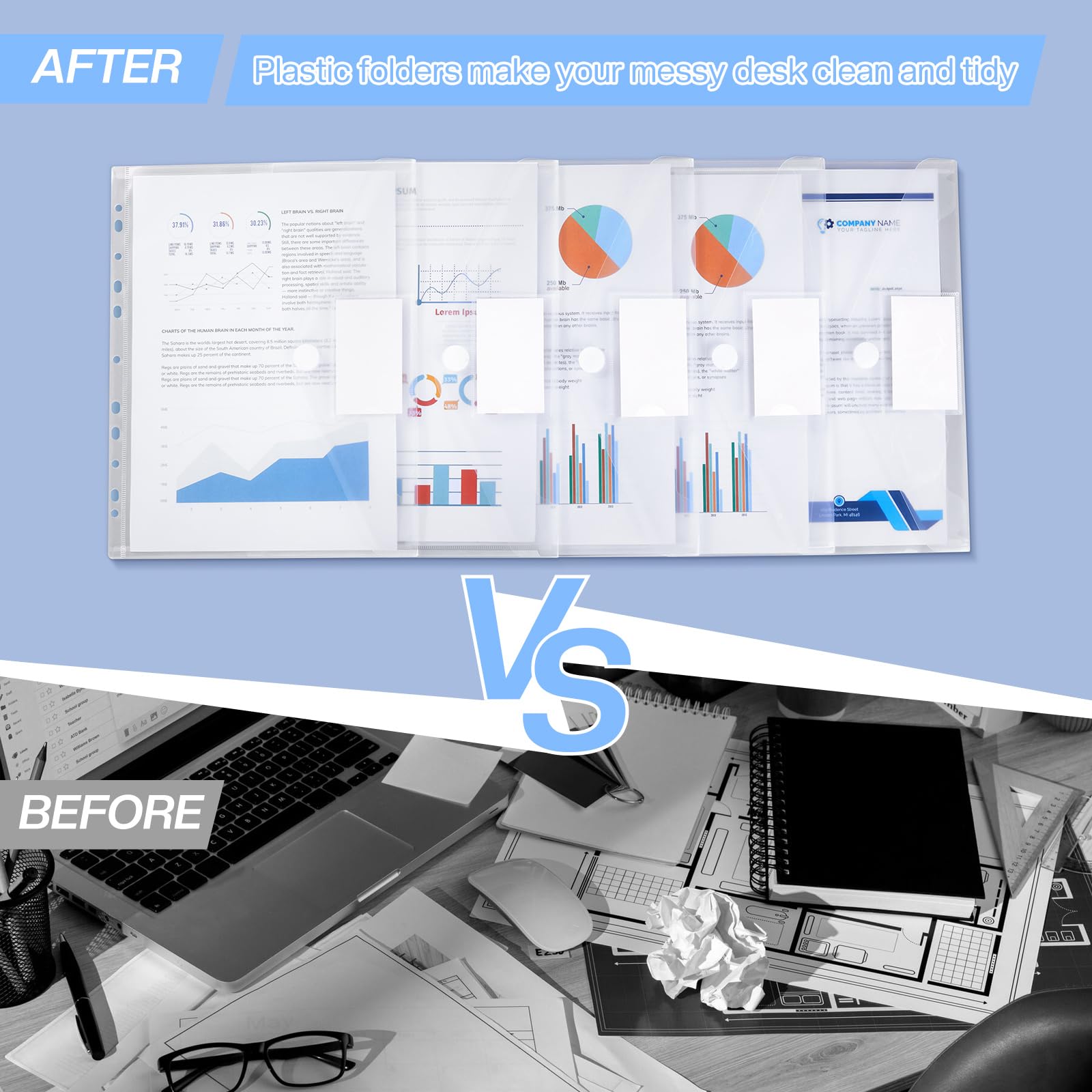 ["High-quality Material: The A4 document wallet made of PP film, which is safe, non-toxic, environmentally friendly, and waterproof, protecting your files.","Label Pocket Design: Each A4 filing folder with a label pocket, allowing you to organize and categorize your files for quick retrieval.","11 Holes for Binder: 11 holes pre-punched on the A4 folders, compatible with standard 2/3/4 ring binders and folders, providing flexible storage space, perfect for daily use.","Velcro Closure Design: The non-removable, sturdy velcro closure secures documents and allows for easy filing and opening of files.","Versatile Use: Transparent A4 sleeves measure 30 * 24 cm and can hold approximately 50 sheets of paper. These document pouches help you organize documents at school, home, work, and in the office."]