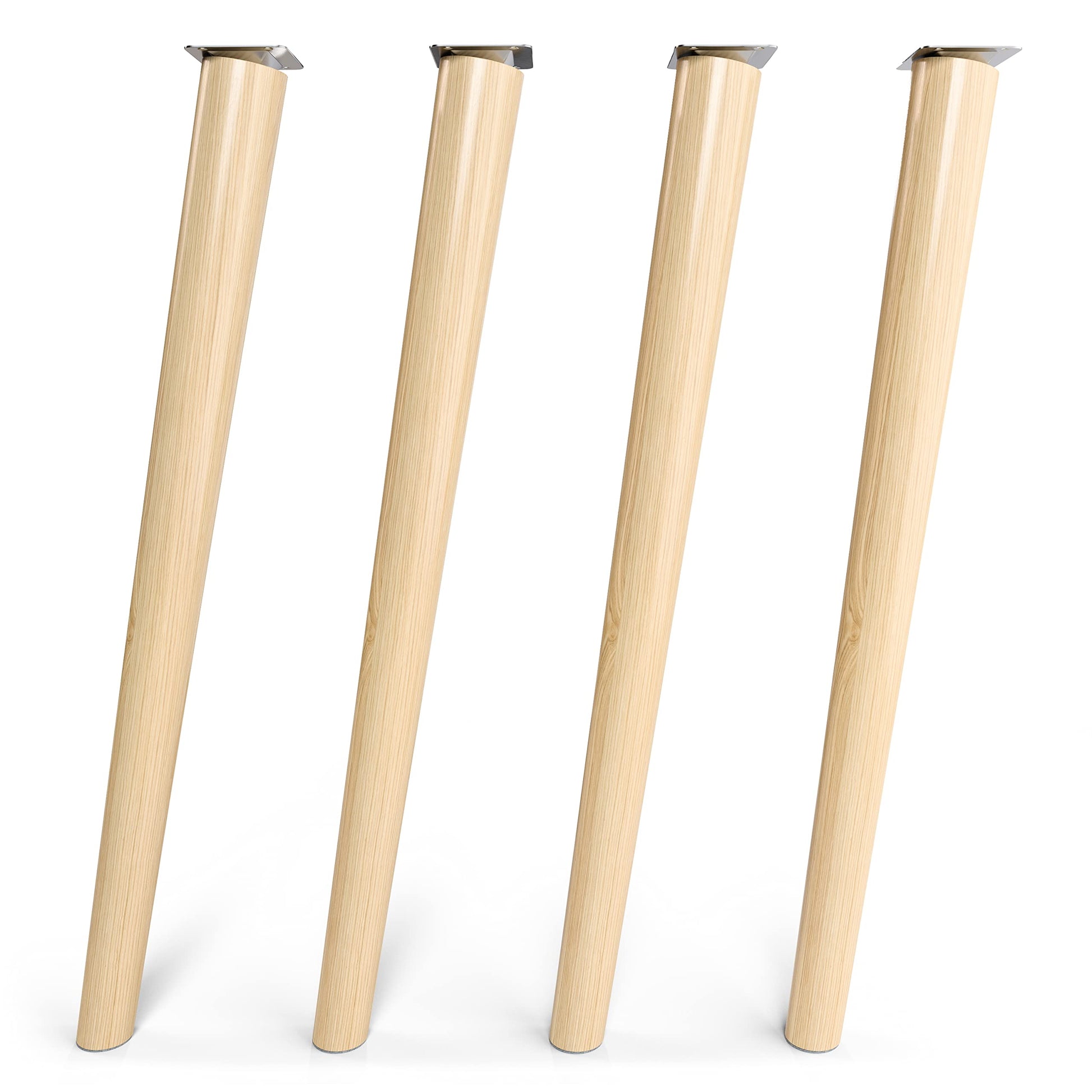 ["Wooden legs (28 inches) for tables, side tables, dressing tables, coffee tables and more furniture ideas","Solid wood (Beech) - Very stable, high load capacity (approximately 165 lbs per leg)","Timeless design, high-quality oil finish for extra durability","Height: 28 inches - round conical shape, slanted orientation","Very stable - precise slanted angle with securely mounted metal adapter plate","Package includes: 4 x table legs with mounting plates + screws and felt gliders"]
