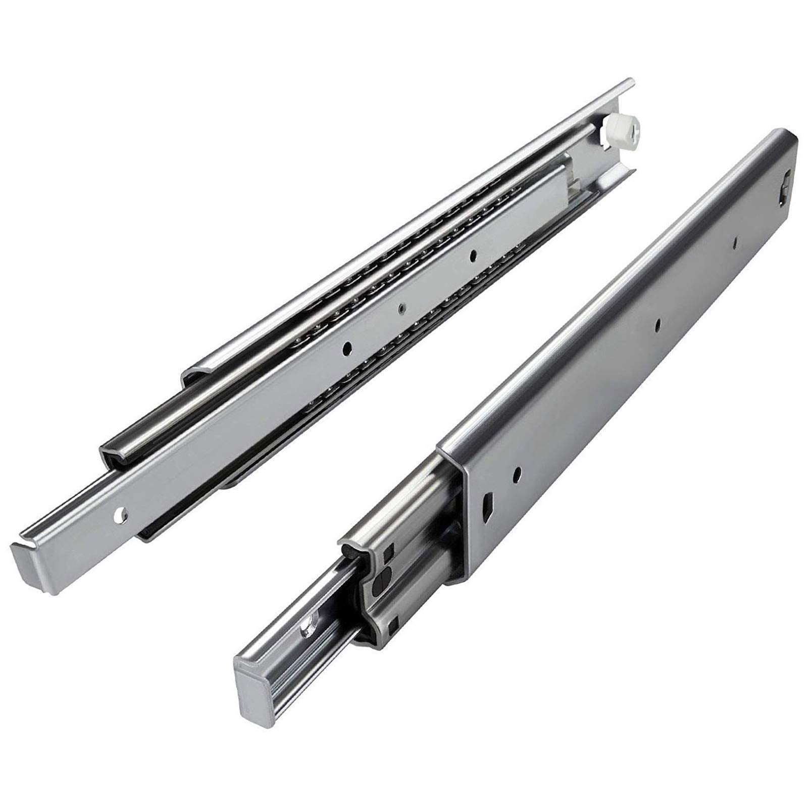 ["Full-extension KV1-100-H53-L700-NF 266 lbs 27.6 in by JUNKER", "Material: Zinc-plated steel / Ball cage with hardened steel balls / Smooth and quiet guide system / With release function for drawer removal / Load capacity: 266 lbs (per pair)", "Dimensions: Length: 27.6 in (retracted, extended doubles the length of the rail +/- 0.12 in) / Height: 2.1 in / Width: 0.77 in / Material thickness: 0.08 in", "Applications: Drawers of various sizes / Industrial manufacturing / Furniture production / Machine building / Vehicle construction", "Scope of delivery: 1 pair (2 pieces)"]