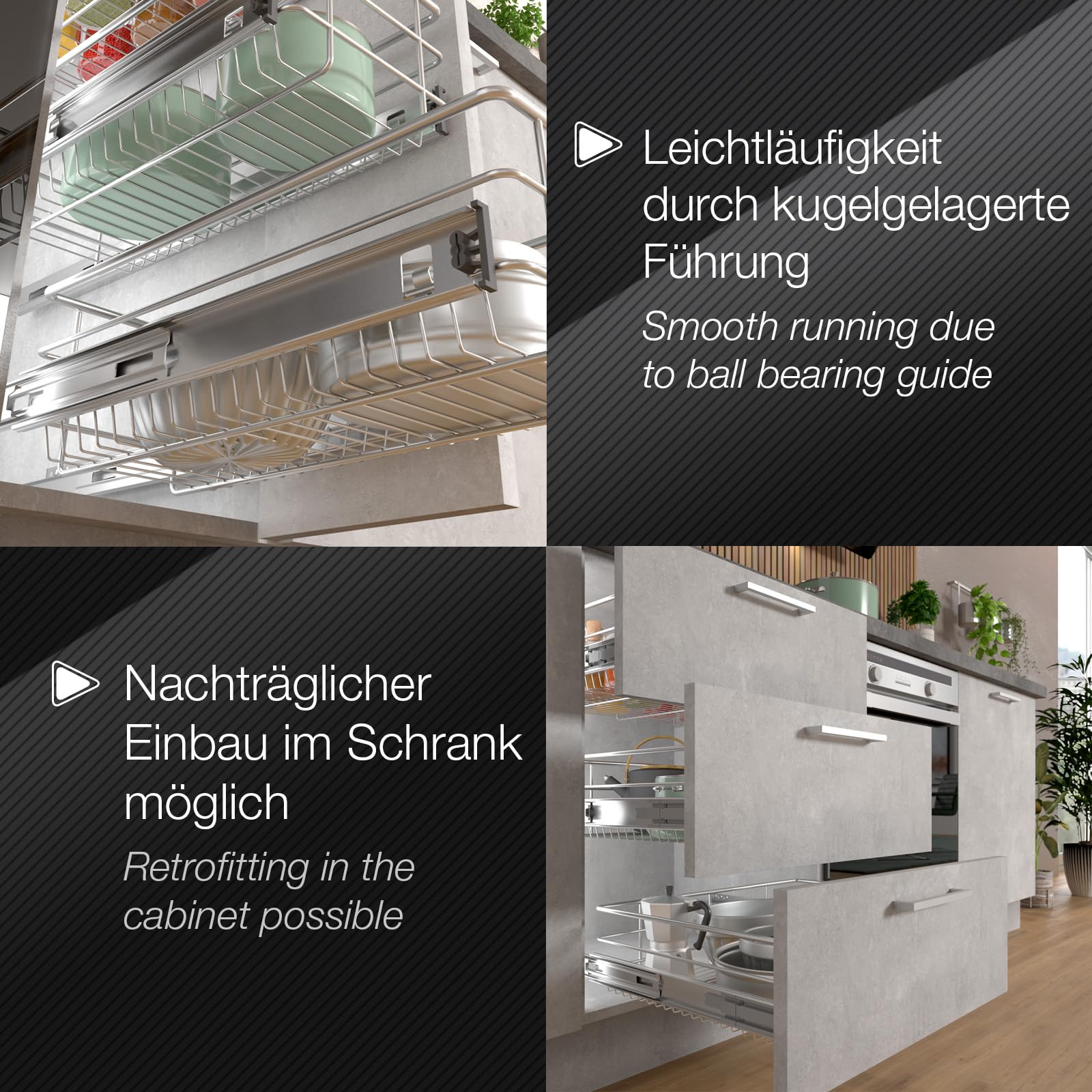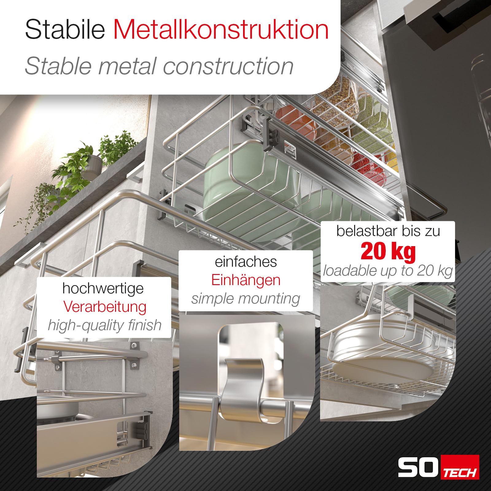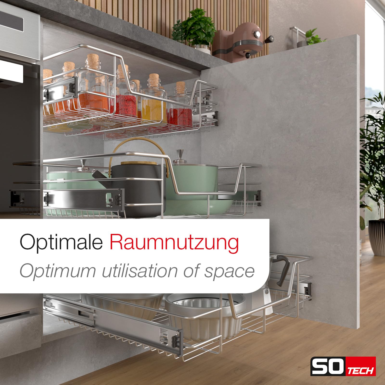["Telescopic drawer for retrofitting / for 50 cm kitchen cabinets / with SoftClose - The telescopic drawer from SOTECH allows you to create additional order in your kitchen, providing more space and storage. Enjoy your new and organized kitchen layout","✅ORGANIZATION: This telescopic drawer facilitates filling and removing cookware in fitted cabinets and is suitable for almost all common kitchens // SOFT-CLOSE - the technically sophisticated system automatically slows down the closing drawer and gently brings it to the final position","✅FEATURES: Material: Metal / Surface: Polished chrome / smooth operation due to ball-bearing guide / Load capacity: max. 20 kg / Easy installation","✅DIMENSIONS: Height: 140 mm / Depth: 430 mm / Basket width: 392 mm / Total width: 458 mm","✅PACKAGE INCLUDES: 1 piece of telescopic drawer for retrofitting – See for yourself! One thing is certain: you always receive the perfect S&O quality and the optimal S&O service."]