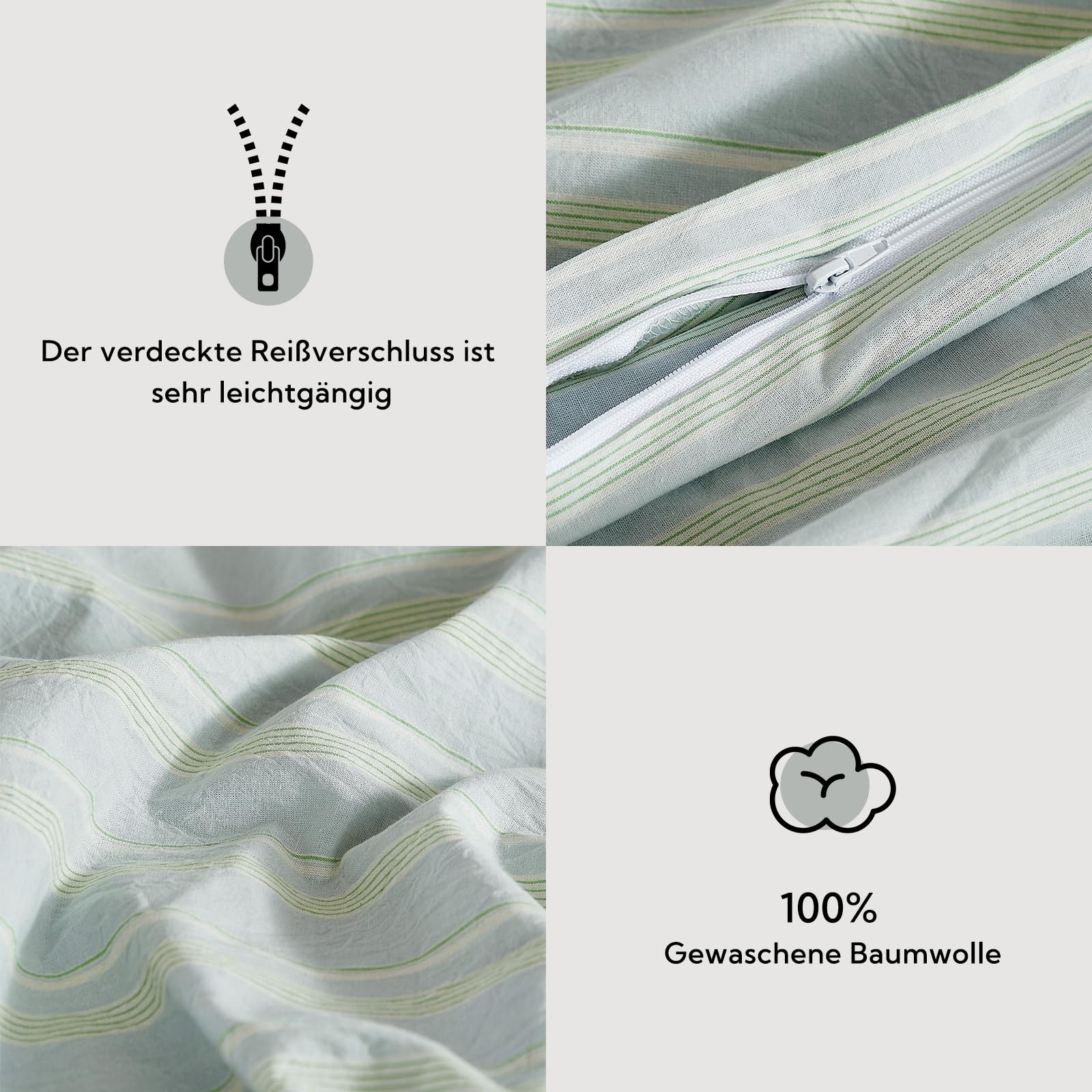 ["【100 % Gewaschene Baumwolle】The SOULFUL duvet cover set is made of 100% cotton and pre-shrunk for added comfort and durability. Made in an OEKO-TEX Standard 100 factory, an independent certification system ensures that the textiles meet high safety and environmental standards.","【Natural Design】This duvet cover is made of 100% washed cotton. The double-sided stripe design is simple and generous, the fabric has been processed through a special process and the surface of the fabric has a slight natural wrinkled feeling. The crinkle finish creates a casual vintage look. Maintains the wrinkled structure without ironing, suitable for modern home use.","【Hidden Zipper and 4 Corner Ties】With the zipper, you can easily attach and remove the duvet cover. Four corner ties secure your duvet inside the duvet cover.","【Great Skin Feel】This bedding set is "Stone Washed" to give it a similar feel to linen bedding. Equally breathable and absorbent, it provides a particularly pleasant skin feel in any season, even on hot summer nights.","【100% After-Sale Guarantee】If you encounter any problems, feel free to contact us. We will do our best to assist you until you are satisfied."]