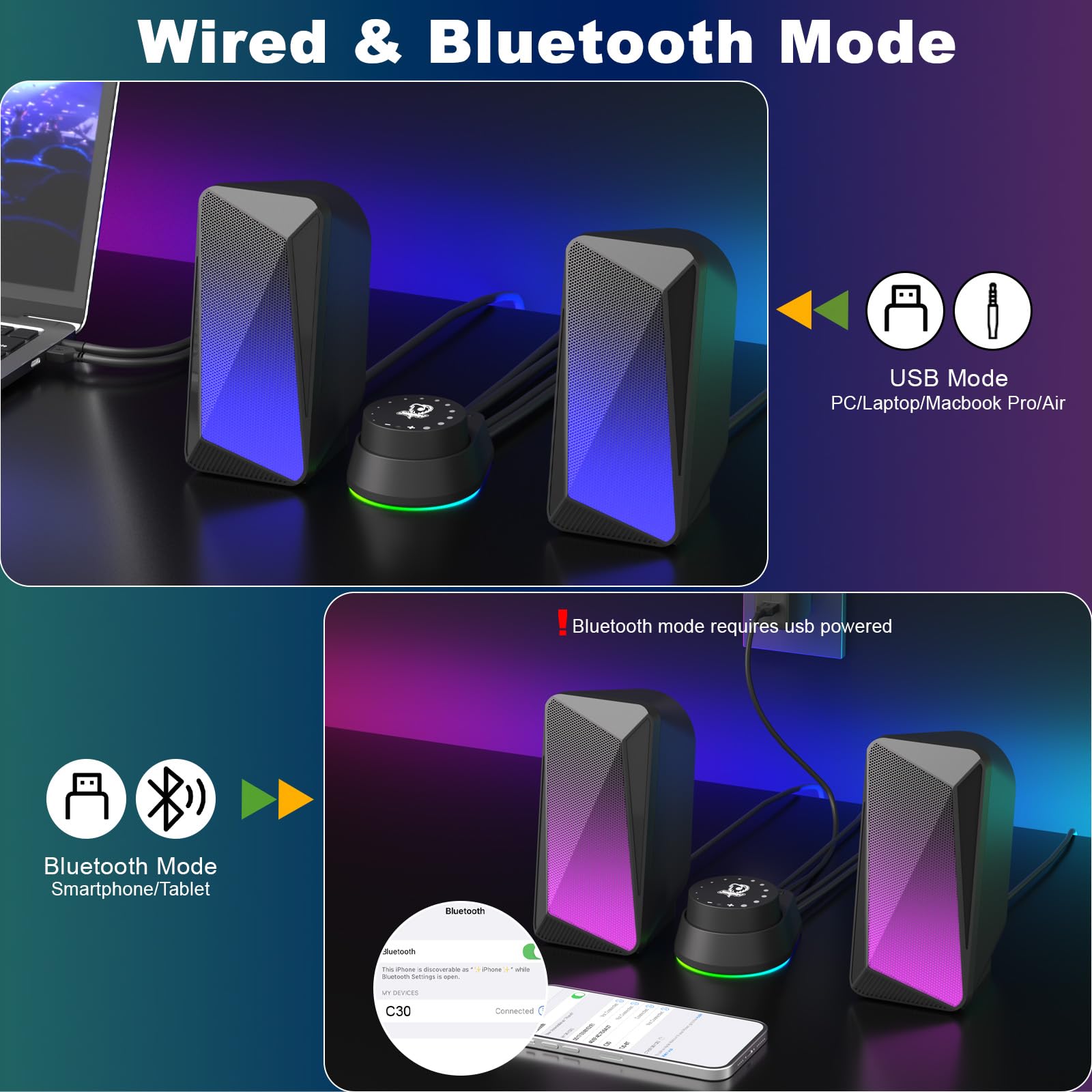 ["[Clear & Powerful Sound]: The 3W*2 dual drivers and 2 full-range speakers deliver clear stereo sound. Bring a smooth auditory embodiment, enjoy home theater, games, and music.","[Wired & Wireless Modes]: This computer speaker allows audio input through 3.5mm jack and Bluetooth. You can press the "M" button on the controller to change the output mode: PC mode (Aux input), Bluetooth mode. When using Bluetooth mode, you can search and connect the "C30" on your mobile phone or other output device to easily use this soundbar!","[Dynamic Lighting Effect]: This computer soundbar features an LED strip, and you can change the lighting color with the light buttons on the side of the speaker. 2 adjustable modes: Gradient, Monochrome. Gives you a strong sense of atmosphere.","[Wide Compatibility]: This PC soundbar is powered through the USB port. Plug & Play. No drivers or software need to be installed. Easily compatible with most devices like PC, laptop, DVD, etc. NOTE: Regardless of the mode you use, you need to power it through the USB port.","[External Desk Controller]: This SOULION speaker has a separate controller that can be placed on your desk to easily control volume, lighting, and mode switching."]