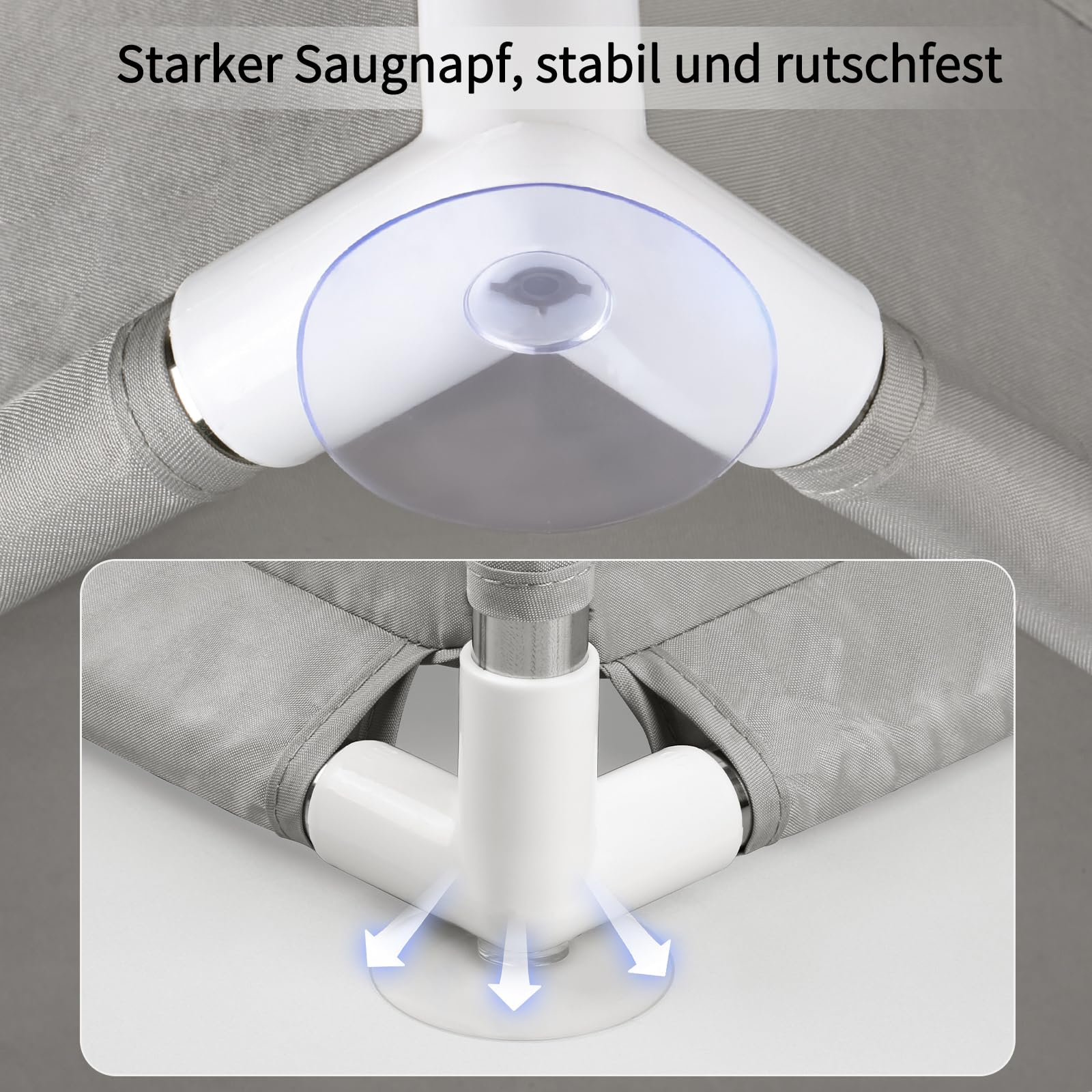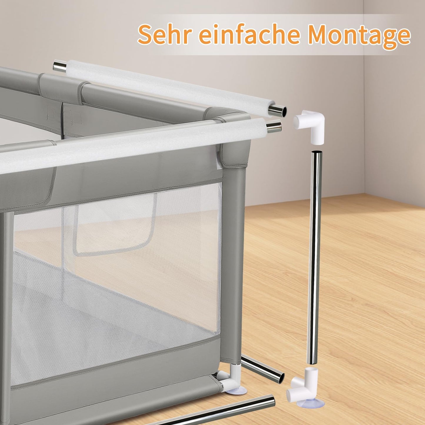 "Safety and stability: The baby gate is made of durable Oxford material and sturdy steel pipe. The anti-slip base is an upgraded and thicker suction cup that still wobbles. The limbs are wrapped with a thick foam sponge so that the child does not bump his head while playing. Added handles that can hang objects or children can learn to pull themselves up."