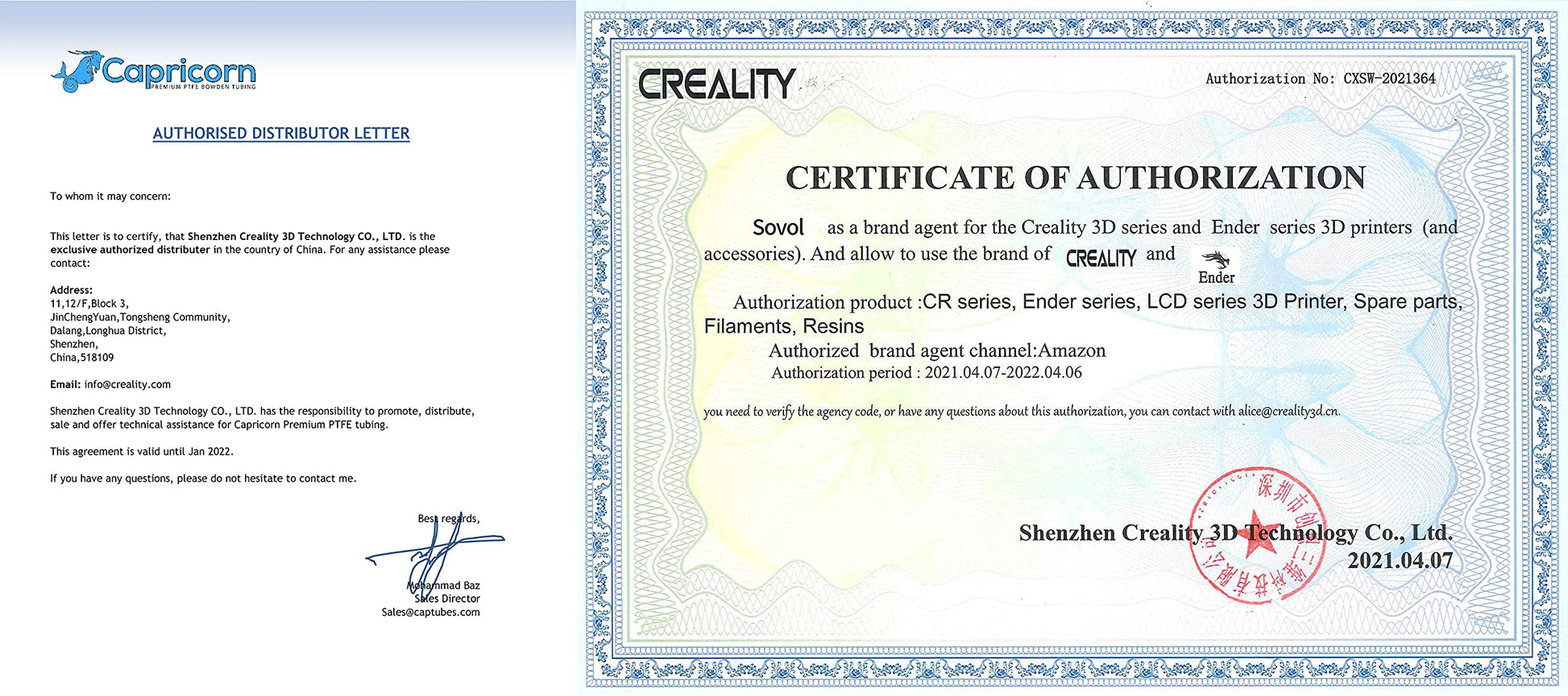 ["Capricorn PTFE is considered the highest quality PTFE tube in the entire 3D printing industry. The tight tolerances ensure that the filament is guided with minimal error between the extruder and hotend directly to the hotend.","The PTFE XS series from Capricorn is designed for resistance to the highest temperatures on the market and is perfect for printing exotic filaments such as ABS, Nylon, and Polycarbonate. Standard PTFE tubes may experience dangerous "outgassing" when the hotend is heated to temperatures above 240°C and deteriorates at higher temperatures. This Capricorn XS series is suitable for use in 3D printing due to its proprietary manufacturing methods.","Improved pneumatic fittings with metal teeth included in this package perform much better than the standard options offered by many cheap 3D printer manufacturers with plastic teeth or cheap locking mechanisms. The extruder connections are PC4-M6 and the hotend connections are PC4-M10.","Package includes two meter long PTFE tube and pneumatic fittings PC4-M6*3 and PC4-M10*3, and tube cutter.","If you are experiencing issues with your Capricorn tube, please email Sovol. We will provide you with a prompt solution."]