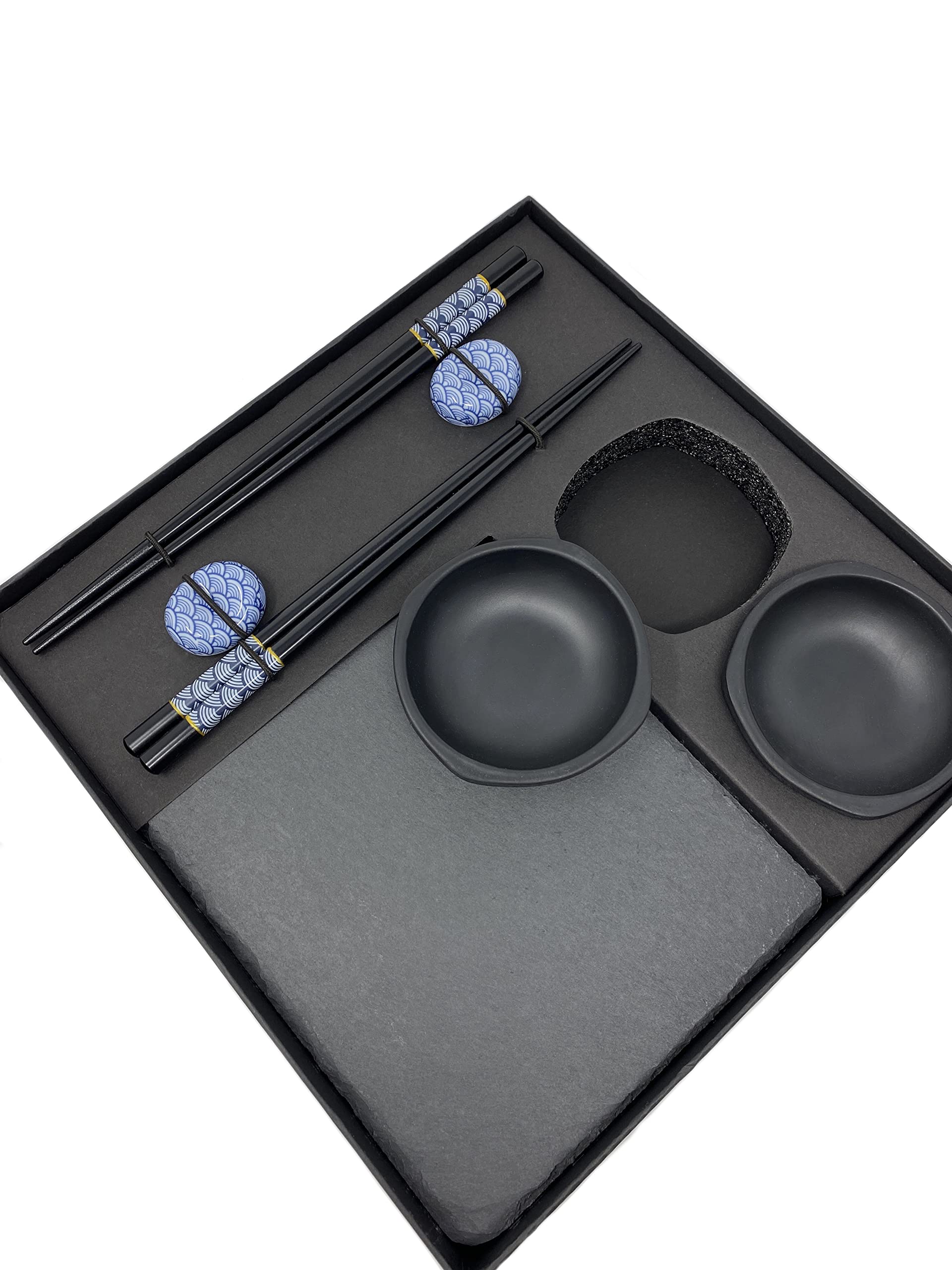 Soypi Sushi Set for 2 - black, 10 piece sushi dish set with chopsticks, slate plates, trays, bowls, delivered in high-quality gift box as a perfect couple's gift.