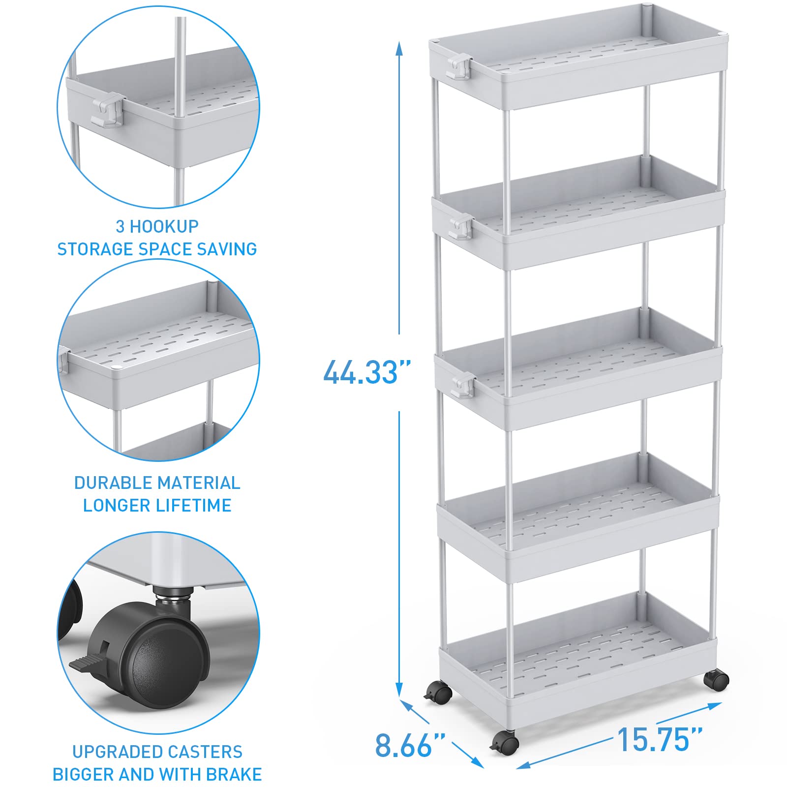 SPACEKEEPER 5-Tier Kitchen Cart, Rolling Storage Cart Shelving Unit on Wheels, Space-Saving Bathroom and Kitchen Shelf for Kitchen Office Bathroom, 113 x 40 x 22cm, Gray.