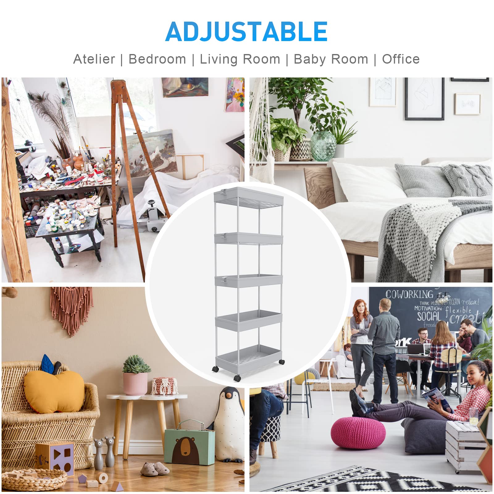 "Multifunctional storage cart: The storage cart works anywhere in the home and makes it cleaner. Use it as utility cart, bathroom cart, kitchen cart, storage rack, tool cart, and more. You can store anything you want, such as toiletries, towels, crafts, plants, tools, groceries, files, etc. It helps to conveniently organize and transport your belongings and eliminate clutter.",