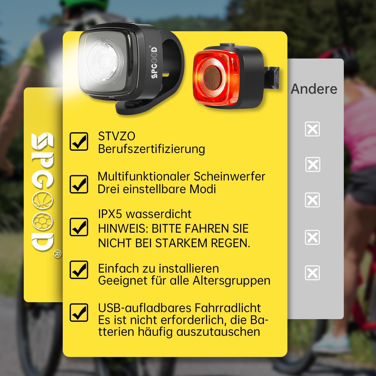 "GLARE-FREE The SPGOOD bike light set led is StVZO, CE certified. Designed with glare-free optics to provide clear vision while riding in the dark, perfect for cycling, hiking, camping, and other outdoor activities.