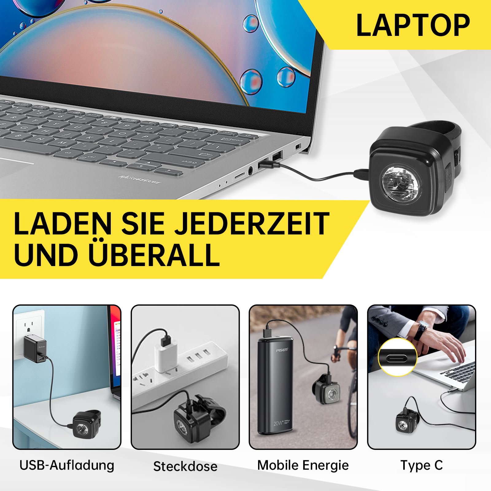 IPX5 WATERPROOF: The waterproof rating of the bike light is IPX5. Note: Please do not ride in heavy rain. Features a Type-C charging port.
