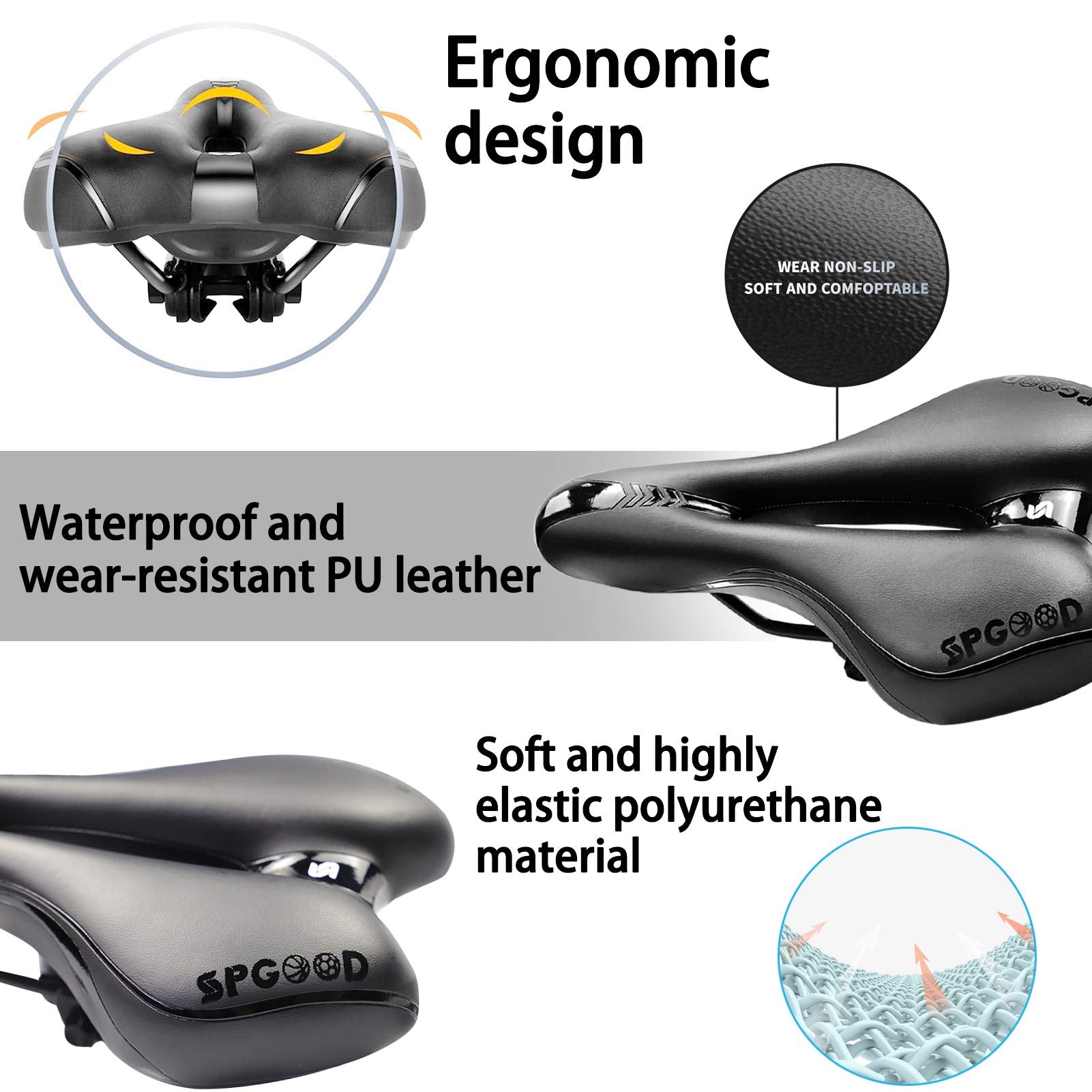 ["COMFORTABLE BIKE SADDLE: SPGOOD Gel bike saddle is filled with high-tech GEL material (High Density Silica Gel), which is soft and flexible, providing a higher level of comfort for longer rides without causing discomfort to the buttocks.","WATERPROOF: The bike saddle has double protection. The surface is made of waterproof PU leather, non-slip, waterproof, wear-resistant, easy to wipe clean, waterproof cover protects the bike saddle from water and dust.","ERGONOMIC DESIGN: The bike saddle features an ergonomic design, hollow and breathable design, and a narrow front design. The ergonomic design supports your buttocks and improves your sitting posture. The narrow and rounded front arch effectively prevents friction of the inner thigh and reduces pressure on the sciatic nerve. The hollow design in the middle provides ventilation and reduces pressure on the perineum.","EASY TO INSTALL: The mountain bike saddles are easy to install. Installation tools and saddle clamp help you quickly and easily install the bike seat. Comes with a universal removable saddle clamp, suitable for most models. Simply remove the old saddle from the seat post and install the SPGOOD bike saddle with a wrench.","UNIVERSAL BIKE ACCESSORY: The bike seat has a universal design suitable for standard bikes, mountain bikes, road bikes, trekking bikes, city bikes, MTBs, etc."]