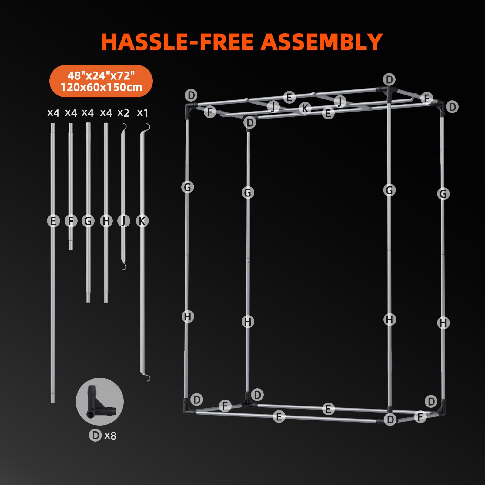 MAXIMUM STABILITY: Sturdy SBS zipper system. Double seams and zipper overlap for effective light sealing. Tool-free assembly thanks to stable corner connectors and sturdy metal rods for safety and stability. Load capacity up to 55 kg. Dimensions (WxDxH): 120x60x150cm.