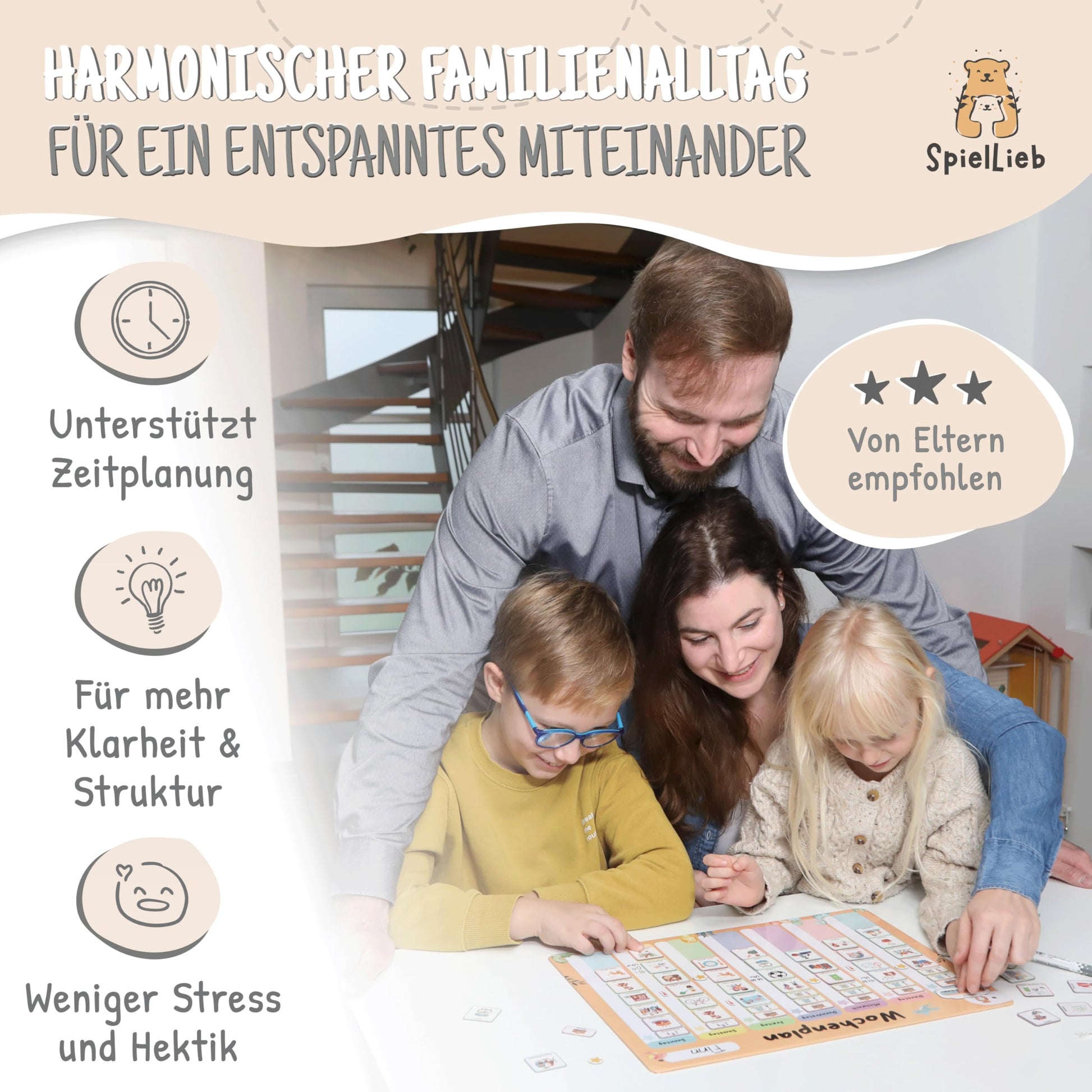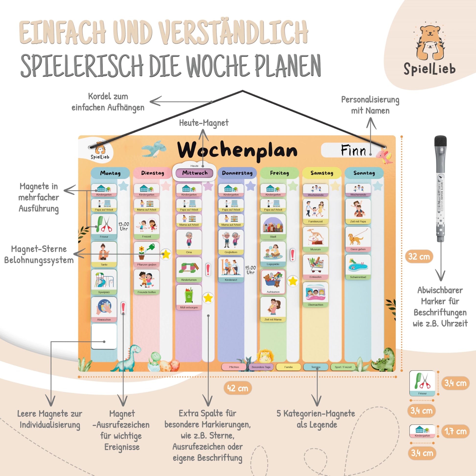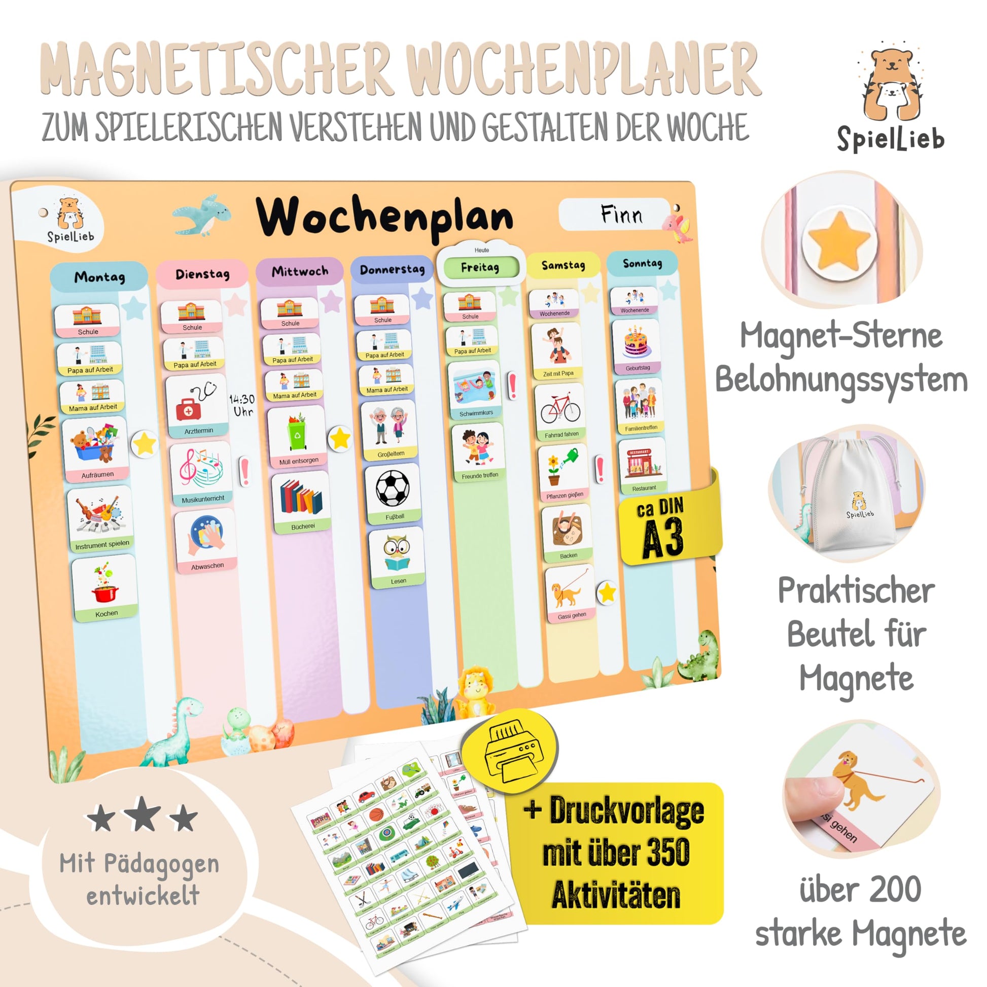 ["⏰ STÄRKT SELBSTORGANISATION: The Montessori weekly planner helps children to organize themselves independently and understand the weekly routine - for more independence & responsibility","🚀 FÖRDERT POSITIVE VERHALTENSMUSTER: Developed by Montessori experts, the weekly planner for children teaches the planning of the week in a playful way & promotes the development of positive routines","🎁 MIT BELOHNUNGSSYSTEM: Reward system supports the development of responsibility and positive habits - perfect routine planner for children for motivation & self-control","✨ ÜBER 200 MAGNETE FÜR INDIVIDUELLE PLANUNG: 216 magnets for flexible weekly planning. Creative magnetic weekly planner, as an ideal task planner for children - tailored to the child's needs","🛡️ ROBUSTE MAGNETTAFEL MIT STARKEN MAGNETEN: The durable magnetic board for children is writable & erasable. Ideal for daily use as a magnetic weekly planner in the children's room"]