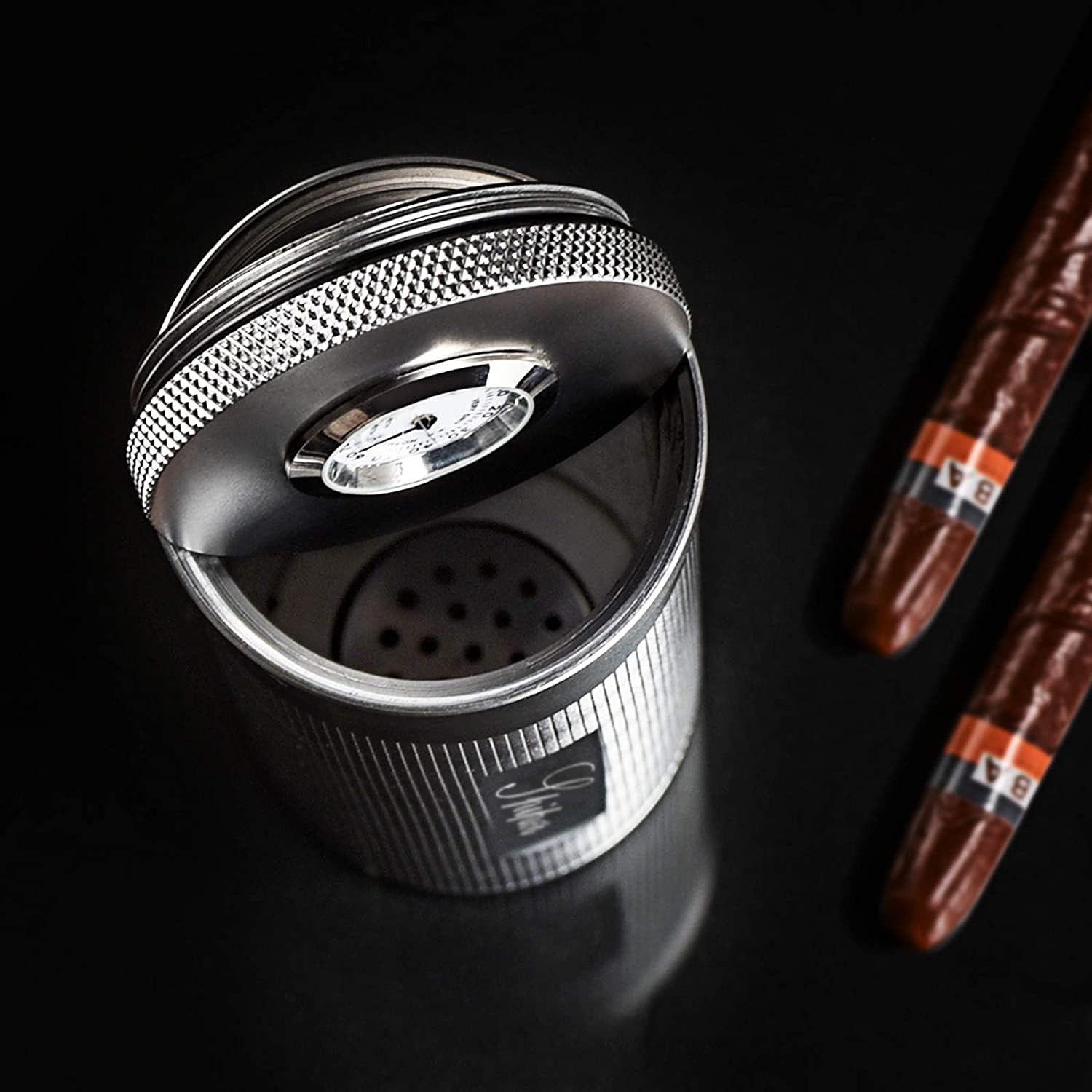 ["PRODUCT SPECIFICATIONS --- Height 7.76 inches x Diameter 2.17 inches, including integrated hygrometer, round humidifier, and dropper, capacity: for 3 to 4 cigars. Designed with an alloy housing, sealed stainless steel lid, hygrometer mounted on top lid. Easy to clean and wash.","RECOMMENDATION FOR CIGAR MOISTURIZATION: Monitor the hygrometer value. Load the cigar when the hygrometer value is between 65 and 75%. Store the humidor in a dry place without direct sunlight or heat.","100% SAFE - Our humidor delivers a natural taste, without any plastic or metal aftertaste, and is lead-free unlike plastic or other materials. The best solution to protect and keep cigars fresh. Rest assured knowing that no toxins will enter your cigars when consumed.","PERFECT CIGAR CASE --- This humidor is perfect for taking to a party, business, vacation, camping trip, road trip, or wherever your journey takes you. Provides excellent protection for cigars and is perfect for any cigar enthusiast.","GIFT --- Packaged in a box, making it a great gift for son, husband, friend, father, best man, clients, boss, and any cigar lover. If for any reason you are not 100% SATISFIED, let us know. We will provide you with the best solution."]