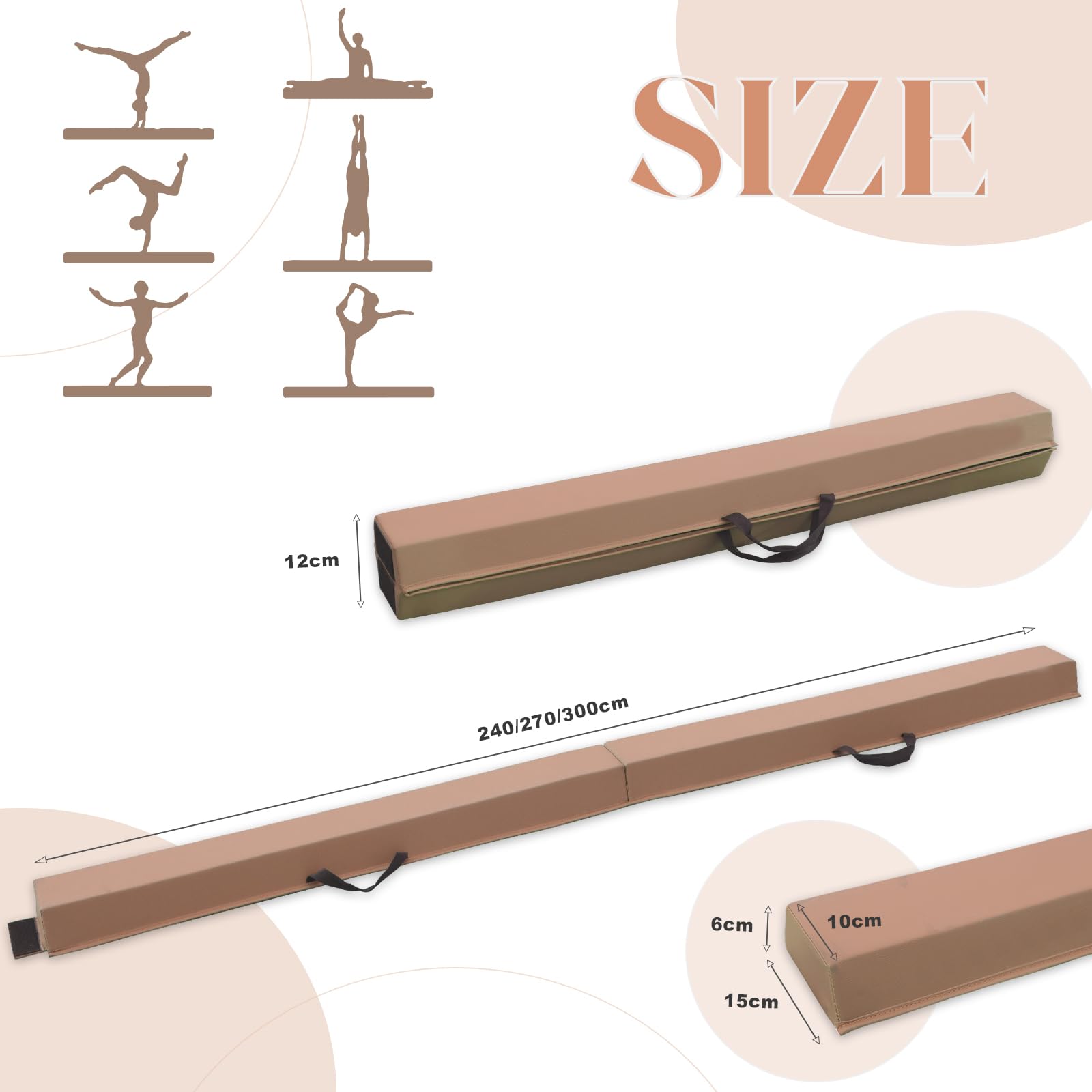 ["☢Long Pro Quality Floor Beam: PU Leather Extra Long Foldable Balance Beam with 4.7 inch top, matching the competition beam! 5.9 inch base holds the beam securely in place, preventing it from tipping over and ensuring safety for the gymnast.","☢Thick practice mat that won't flatten: Our padded beam is covered with PU material and has a non-slip rubber bottom for a soft, stable exercise surface that won't flatten over time.","☢Lightweight and durable: Our folding beam weighs only within 6.6 lbs and can be easily carried and stored in any closet and home. Additionally, to achieve tear-resistant and durable quality, we use extremely strong double stitches, reinforcing the seams on all sides.","☢Wide application: Our balance beam is a high-quality beam for girls who want to practice movements like handspring, cartwheel, handstand, jump, leaps, walkovers, and kicks. Complete your home gymnastics equipment set with the gymnastics bar to complement the set and use a mat for extra safety. This is a great home gymnastics equipment.","☢Skills development for children young gymnasts: Balance beam provides safety and reassurance for your young gymnast, making it a perfect device for children and toddlers to develop skills at home. We are responsible for our products. Customer satisfaction is what we pursue. If you have any problems, please do not hesitate to contact us."]
