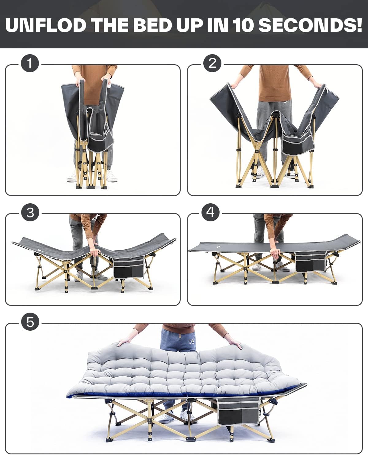 ["188 X 71cm camp bed with 2KG comfortable mattress: The 2 KG mattress of the Sportneer folding bed provides you with additional comfort and allows you to sleep more comfortably on this portable cot. In winter, a warm mattress keeps moisture and cold away from you, so nothing stands in the way of a restful, deep sleep. (Cleaning instructions: For localized stains, you can wash the spot by hand with detergent. Machine washing is not recommended.)","204KG High Load Capacity: Thanks to the X-shaped, 2.5 cm thick steel tubes of the camping bed, the carrying capacity, durability, and longevity of the Sportneer folding camp bed are particularly high. (Note: Since the head and foot of the cot are not supported by X-shaped steel tubes and therefore cannot carry heavy objects, you must not sit directly on the head or foot of the cot).","Folding and unfolding in just 10 seconds: The last thing you want at bedtime is a complicated setup of your bed! Luckily, the Sportneer guest bed can be unfolded in seconds, and if you want to move this handy folding guest bed out of the way, it can be folded up in less than 10 seconds and stored in the carrying bag!","Large pockets on both sides: Keep all your essentials within reach! The 2 practical side pockets are perfect for storing sunglasses, books, phones, headphones, water bottles, and more! Additionally, our folding beds are made of 1200D Oxford fabric, which is thicker, more resistant to wear, waterproof, dustproof, and durable.","90 Days Warranty Service: Still afraid of buying low-quality products? With the Sportneer folding camp bed, you will definitely feel that it is worth your money. Additionally, we offer both a 90-day warranty service and all-day customer service. If you have any questions about the product, you can always contact us, and we will respond within 24 hours and provide friendly customer service."]