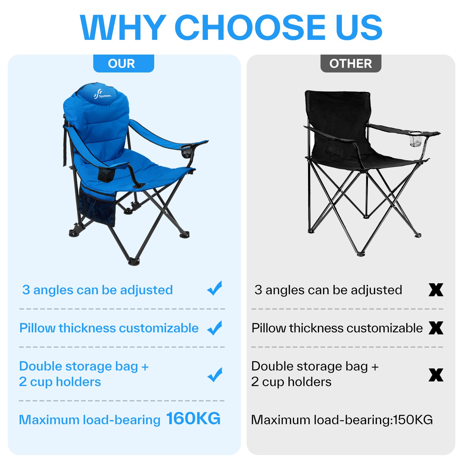 ["3 ADJUSTABLE ANGLE: Thanks to the 3 adjustable angles, you can adjust the camping chair to your preferred body position. Finally, you can sit back and relax. Whatever position you prefer, you can easily adjust this adjustable fishing chair to your liking. Simply remove the screw from the backrest of the folding chair and slide it into the correct adjustment hole.","SAFE AND STURDY: This reliable foldable camping chair is not only comfortable, but also sturdy! The folding camping chair is equipped with high-temperature powder coating, ABS plastic, 600D Oxford fabric, and premium steel tubes that can support a weight of up to 160 kg (353lbs).","BUILT-IN COMFORT: The support of the quilted seat allows you to sit comfortably in the chair. Finally, you can bring relaxation wherever you go!"]