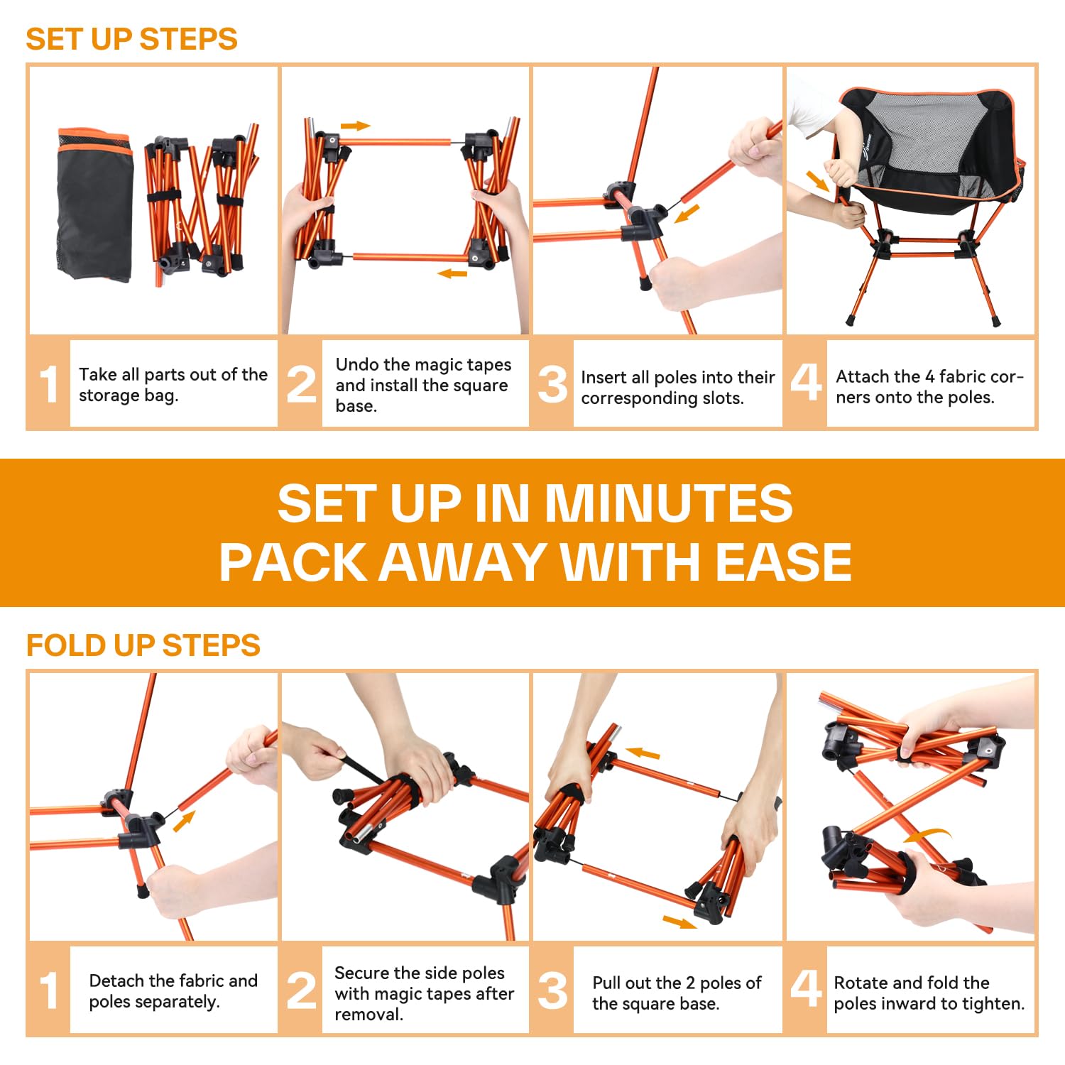 ["Higher stability: Say goodbye to an unstable camping chair. For ultimate stability, we have designed our camping chair with a square structure and 4 support points. Although our chair may be a bit more challenging to assemble due to its unique design compared to other models on the market, we believe the benefits are worth the effort.","Ultralight and compact: When camping, hiking, or heading to the beach, you should have as much comfort as possible! The portable outdoor camping chair from Sportneer weighs only 1.98 lbs and can be folded into dimensions of approximately 13.8" x 4.7" x 4.3", making it easy to carry. Start an outdoor adventure with the ultralight camping chair stored in its carrying bag.","Unmatched quality: Don't settle for a cheap lightweight folding chair that isn't reliable enough. The portable camping folding chair from Sportneer is made of a high-strength 7075 aluminum alloy and 900D Oxford fabric. Thanks to the two side pockets of this chair, your small accessories are well organized.","Lightweight, portable, and foldable camping chair: Relax and enjoy nature without worrying about instability, thanks to the reliable stability of our chair. The maximum load capacity of this sturdy, portable camping chair is up to 330 lbs. Compact chairs from Sportneer for adults for the beach and camping, foldable chair for backpacking and outdoor use, collapsible chair for camping, outdoor picnics, and traveling.","Easy setup & simple cleaning: Thanks to the foldable Oxford fabric and metal poles, assembly has never been easier. No DIY skills required! Plus, it's easy to clean - simply wipe with a damp cloth or soapy water and you're good to go."]