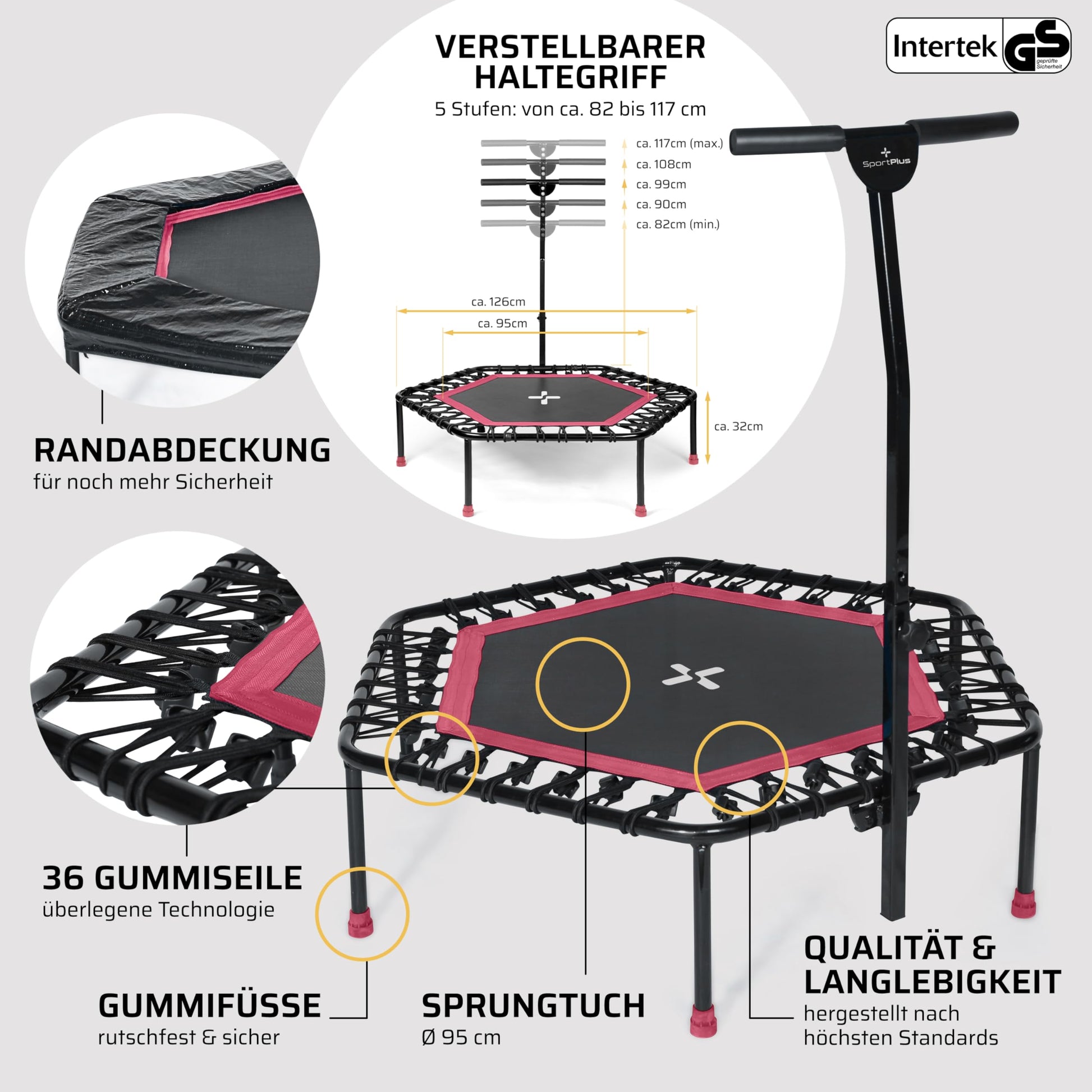 SportPlus Fitness Trampoline for home use, trampoline with adjustable handlebar, bungee suspension, workout & cardio training, premium quality Designed in Germany, 130kg capacity.