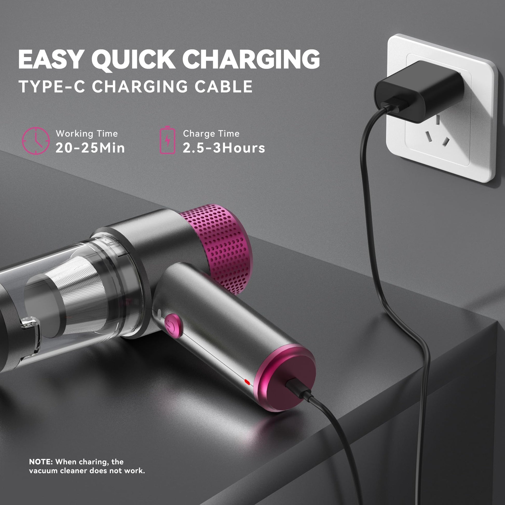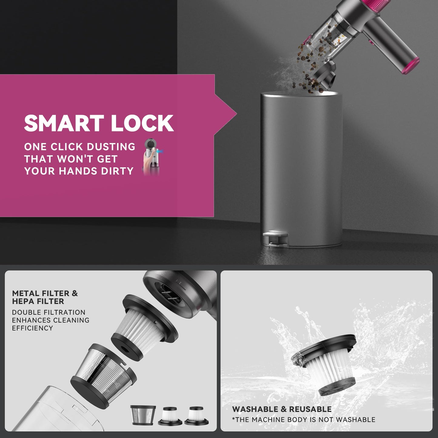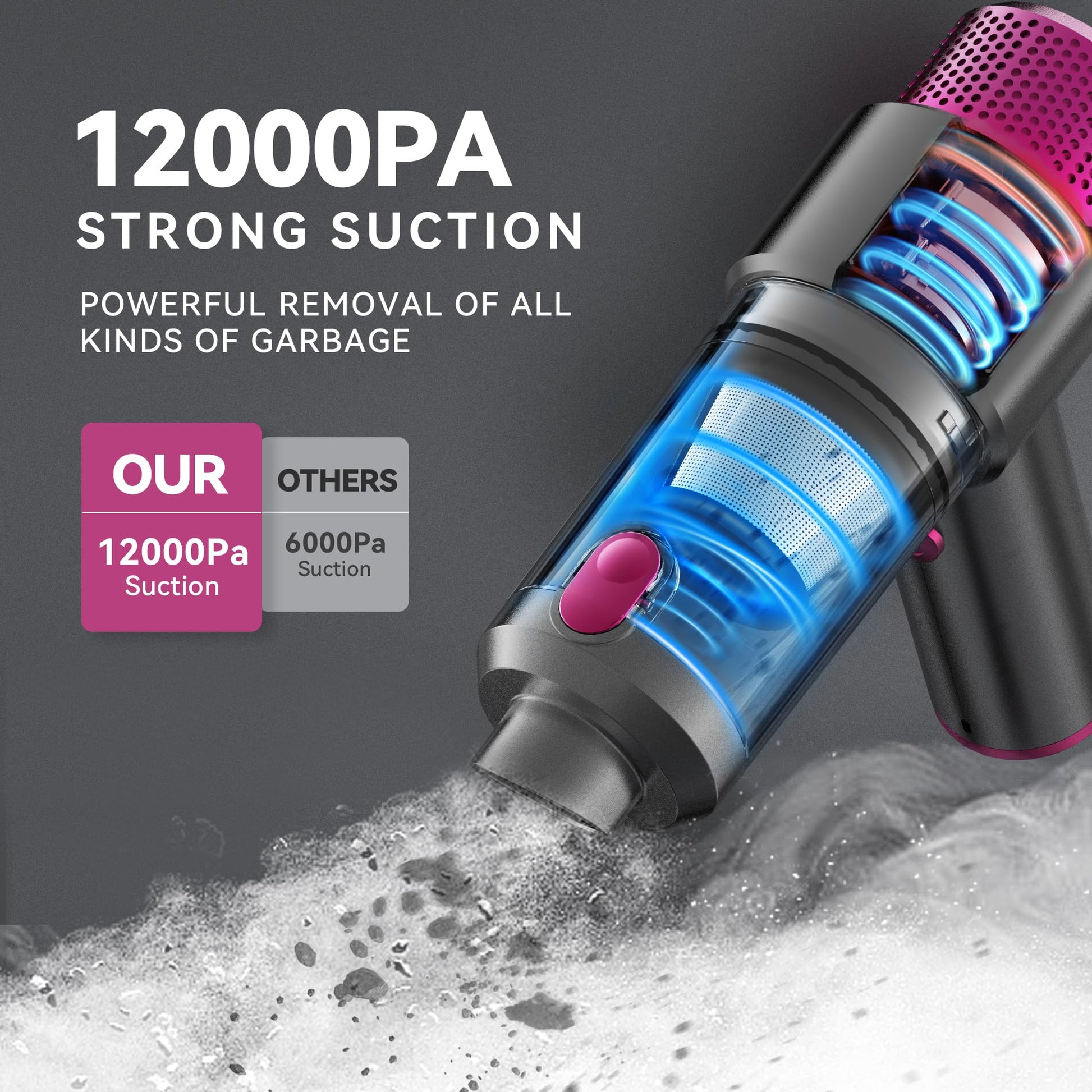 ["⚡【Powerful Suction and Noise Reduction】This car vacuum cleaner features a high-performance motor with suction power of up to 12000 PA, making it easy to clean dust and food residues. Thanks to noise reduction technology, the operating noise level is less than 75 dB, making it very suitable for cleaning dust, paper scraps, pet hair, food residues, etc. Your home or car will be cleaner, allowing your child to play safely.","🔋【Fast Charging and Long Battery Life】Rechargeable vacuum cleaner has a built-in 4000mAh lithium battery with a fast charging port. It can be easily charged with a car charger, mobile power, laptop, rechargeable batteries, and more. It takes only 3 hours to fully charge the battery and provides 15-20 minutes of use. Save time on your cleaning tasks.","⭐【Portable & Cordless Design】This cordless car vacuum cleaner has a sleek design and weighs only 410 g and has a length of 207 mm, allowing for easy operation, portability, and storage. The cordless and one-button start design ensures effortless and quick cleaning in narrow areas at home, office, or in your car.","💎【Effortless Maintenance Portable Vacuum】This cordless portable vacuum cleaner is easily disassembled with just one click, allowing you to easily empty garbage and clean the vacuum cleaner. The 2 HEPA filters can be washed and reused, ensuring efficient suction power while keeping dust and dirt out to prevent clogging.","🏆 【Deep Cleaning】The unit is equipped with LED lights and includes 12 accessories: 1 x Assembled Vacuum Cleaner, 2 x Hepa Filters, 2 x Brush Tool, 5 x Nozzle, 1 x Charger, 1 x Metal Mesh, 1 x Storage Bag"]