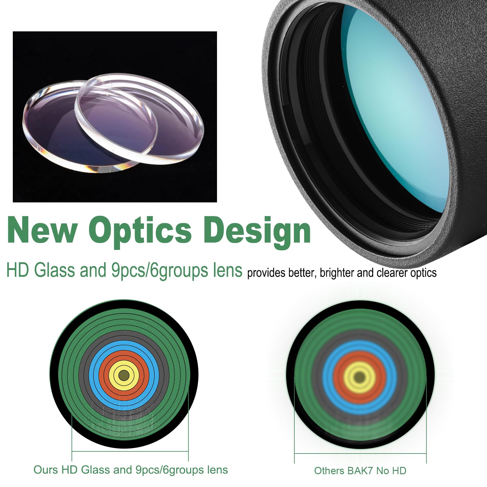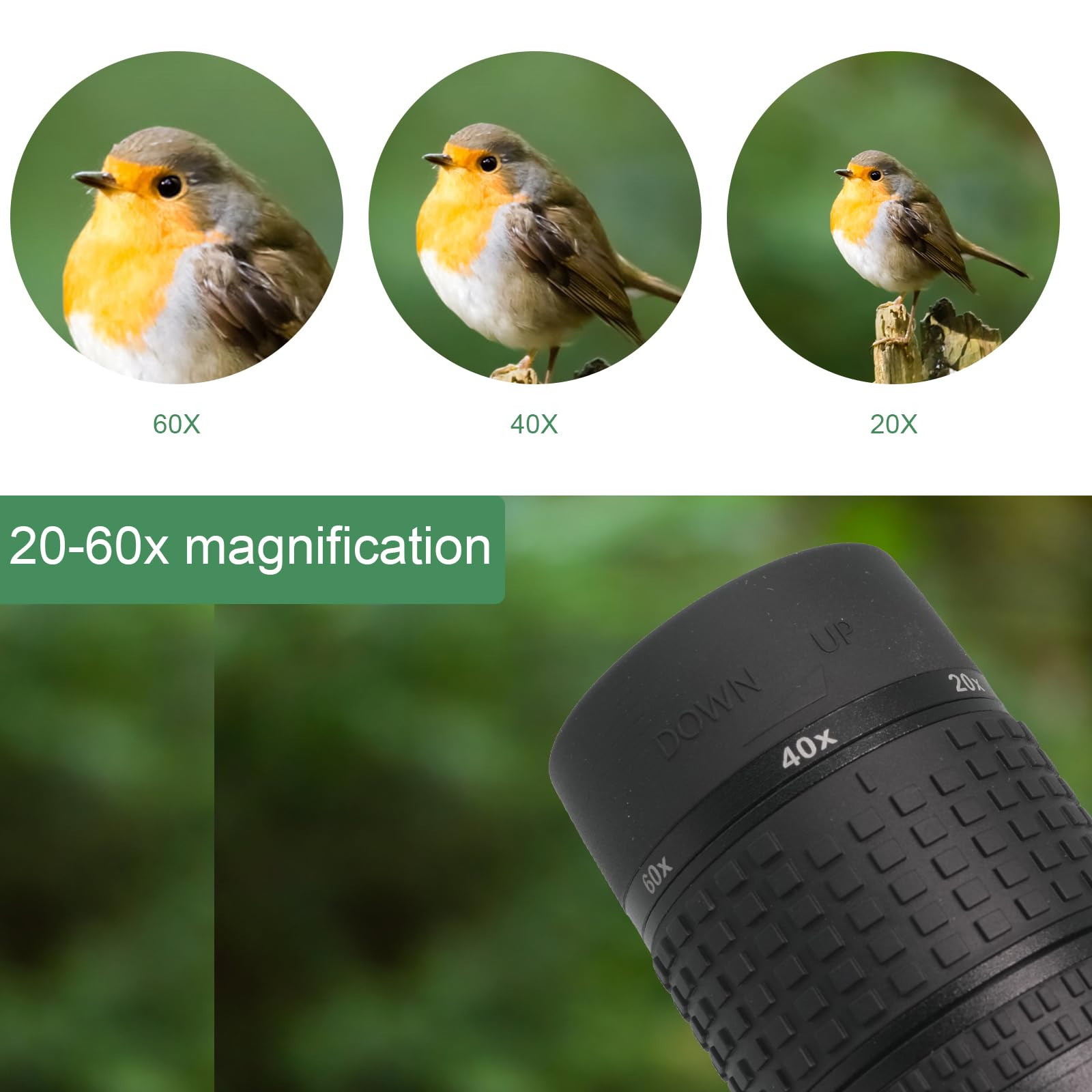 ["80mm large lens; Large 80mm fully multi-coated green film lens provides The hit rate is clearly visible at both short and long distances; Eyepiece with 25mm diameter; expands your field of view and allows you to have a wide field of view at 85-50ft/1000yards.","Optical HD elements; The optical system 9 pieces 6 groups glass, consisting of premium components, produces vivid high-definition images. HD glass has a 60x magnification for perfect image quality without chromatic aberrations.","IPX7 waterproof, fogproof, weatherproof design; Durable framework and rubber armor provide non-slip grip, shockproof and durable external protection. O-ring seals prevent moisture, dust, and dirt from entering the scope for reliable performance in all environments","Twist up eyecups design; You can have a comfortable viewing experience whether you wear glasses or not; The extendable sunshade can be expanded to protect the eyepiece and reduce glare","The rotary ring allows the spotting scope or eyepiece to be rotated (you can not only look through from "above" but also from the side).","Adjustable 20x-60x powerful magnification for sports shooters bird watching. Fully multi-coated with BAK4 porro prism design provides clearer and brighter images.","Adjustable tripod, universal phone adapter, cleaning cloth, carrying/storage bag, eyepiece and lens protection covers","The high-quality rubber armor structure ensures an effective non-slip grip."]