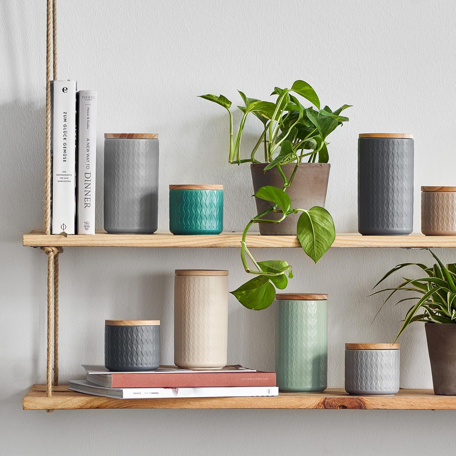 SPRINGLANE Ceramic Storage Jars 2-piece Set with Wood Lid Gray, Rubberwood Lid, Storage Containers, Fresh-keeping Jars