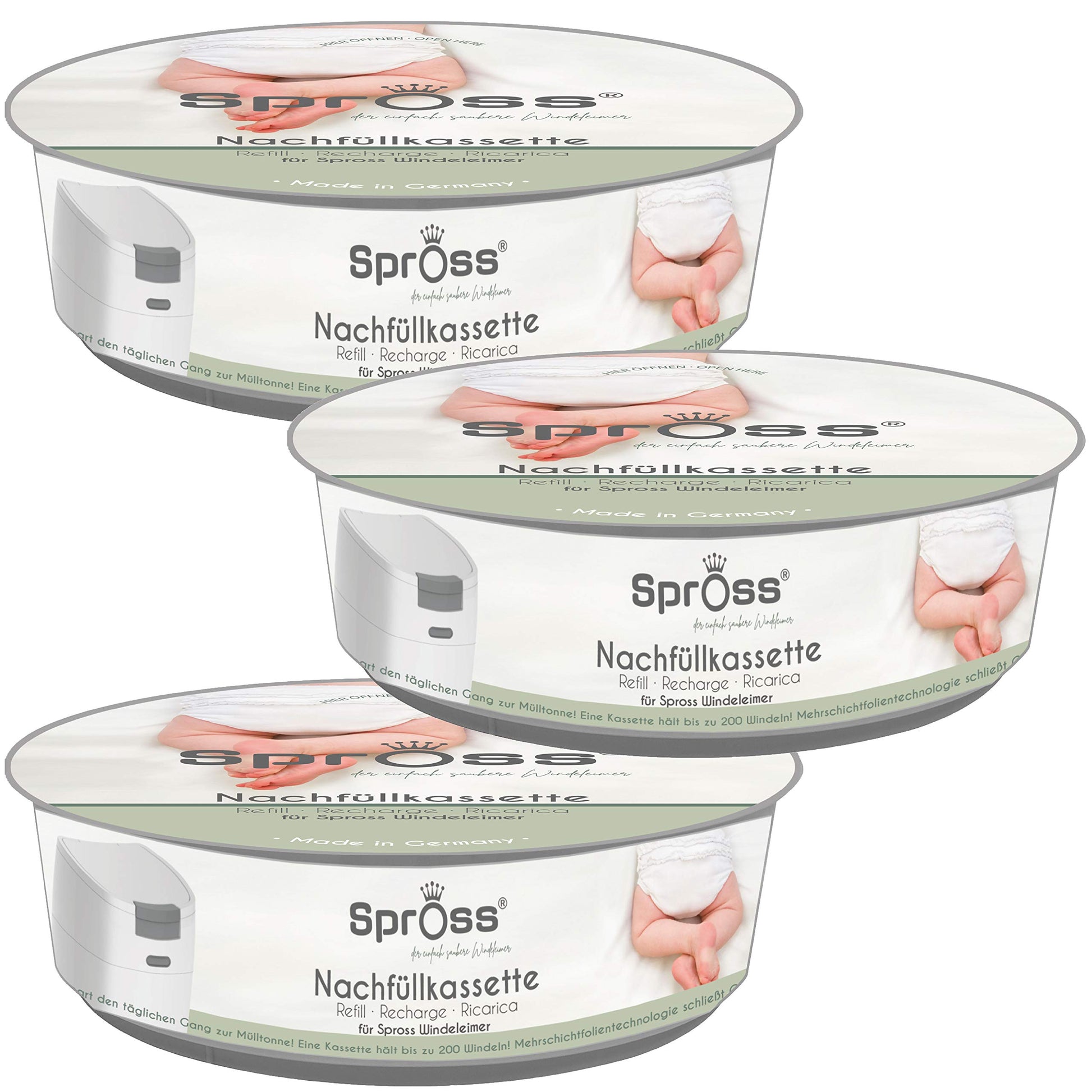 ["FOR YOUR LITTLE ONE - Refill cassettes suitable for the Spross Diaper Pail.","HIGH BARRIER FILM - Protects against unpleasant odors due to the multi-layer film technology.","SECURELY CLOSED - The Spross Diaper Pail's sealing mechanism prevents unpleasant odors from escaping.","ECO-FRIENDLY - Less film consumption compared to other disposal systems, as the sealing mechanism eliminates the need to individually wrap each diaper.","EXTRA LARGE CAPACITY - One refill cassette holds up to 190 diapers. *Test conducted with size 1 diapers."]