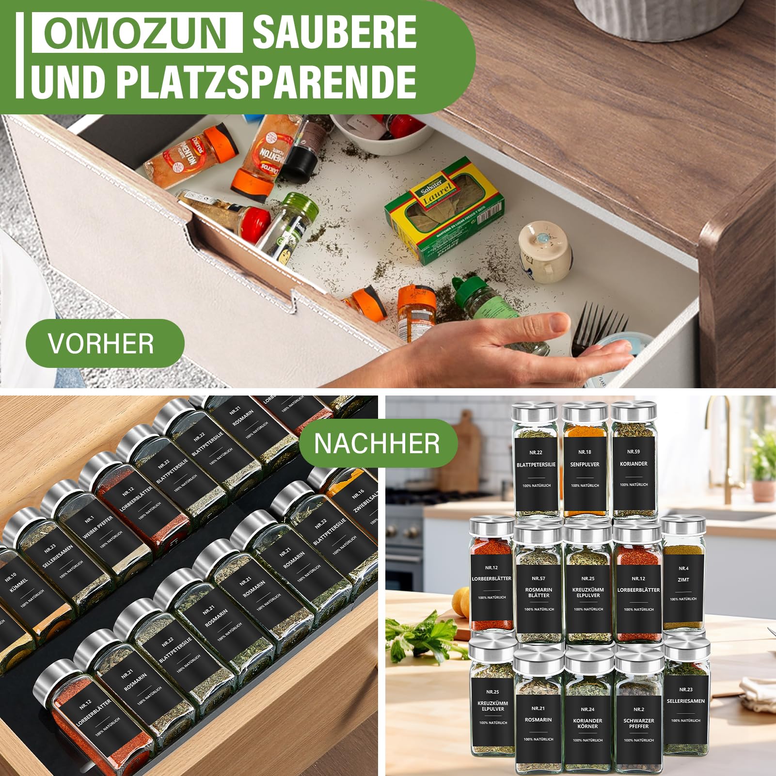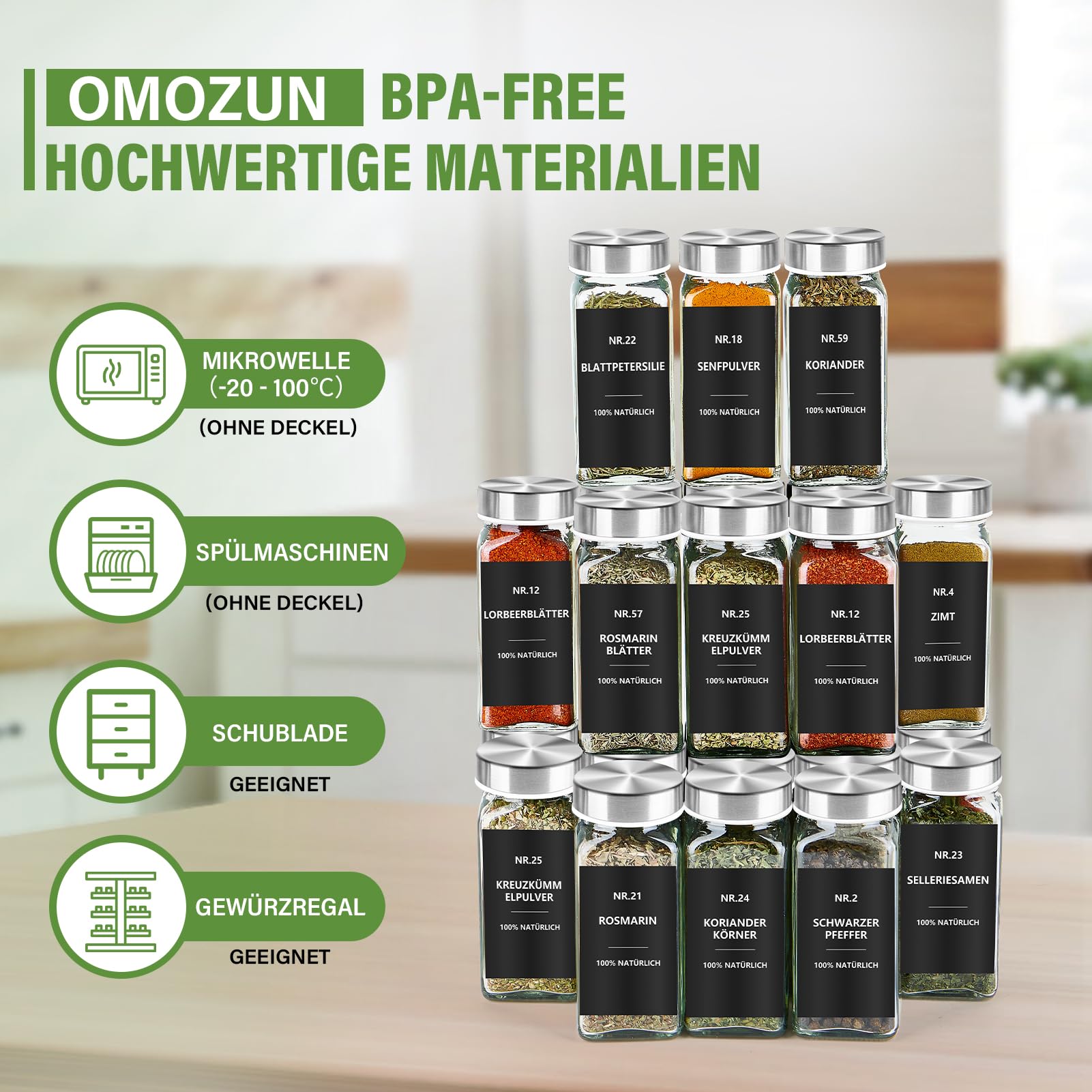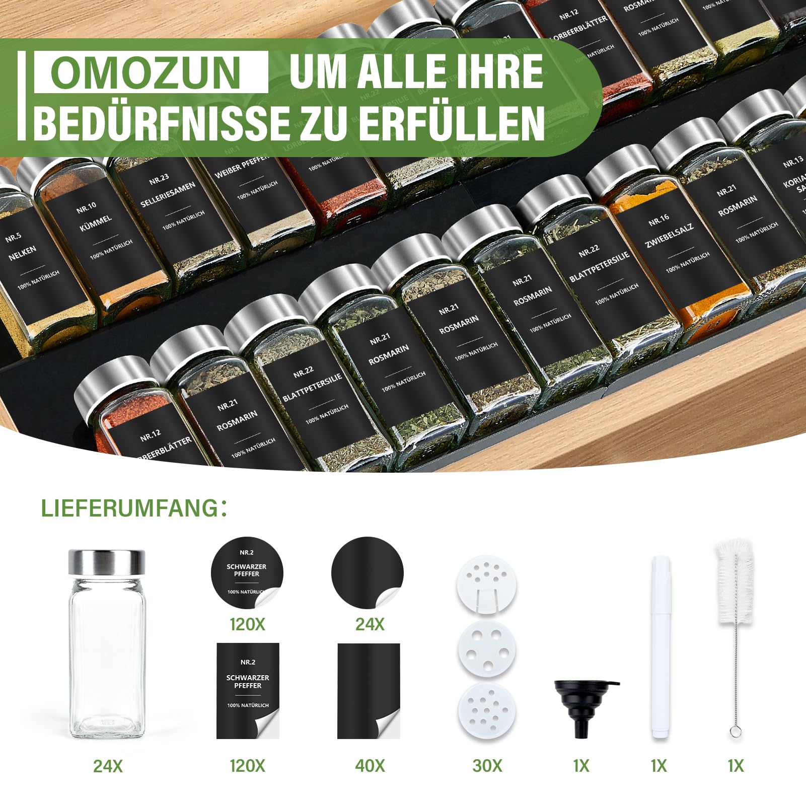 "SPICE JARS SET: Our spice jar set includes 24 x 4 oz high-quality square spice shakers, 62 empty water-resistant labels, 240 German labels, 30 sprinkle inserts, funnel, label pen, cleaning brush, and unbreakable packaging. BPA-FREE, HIGH-QUALITY MATERIALS: The spice containers are made of lead-free, thick-walled glass and eco-friendly, food-safe plastic. Dishwasher safe and mothproof. The airtight lids keep moisture and air out. SPACE-SAVING: Our spice jars have a square design that maximizes space on your spice organizer, in drawers, and on your workbench. No more worries about spice storage. ORGANIZATION AND STYLE IN THE KITCHEN: Present your spices uniformly and stylishly in our 24-piece set of spice jars. The versatility in your kitchen provides a high-quality aesthetic and preserves freshness and quality. RISK-FREE INVESTMENT: We are confident that you will love our spice jars. If the products have quality issues, please contact us via email, and we will offer you a 100% satisfactory solution."