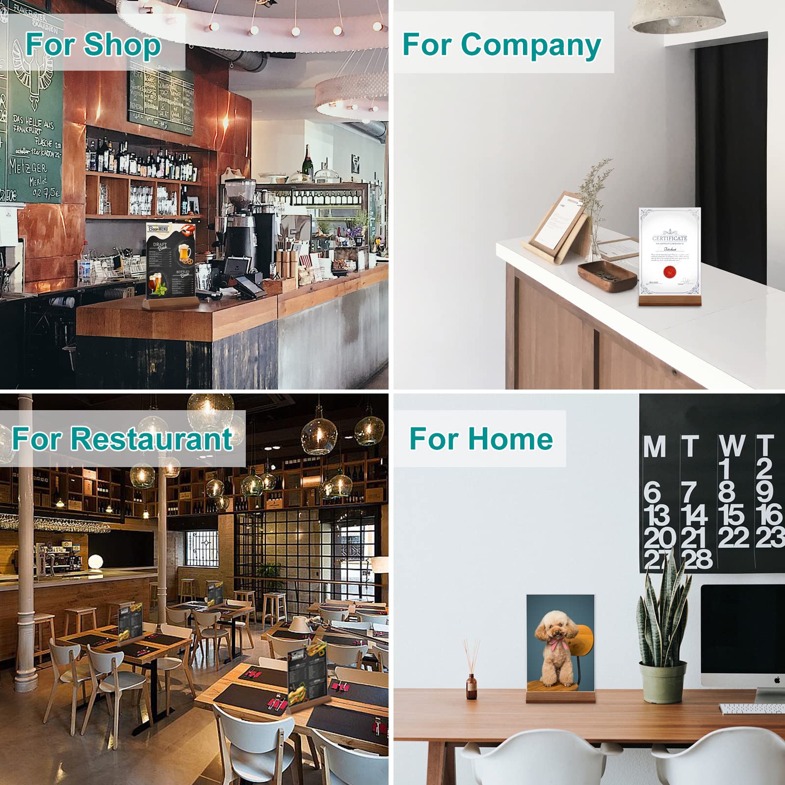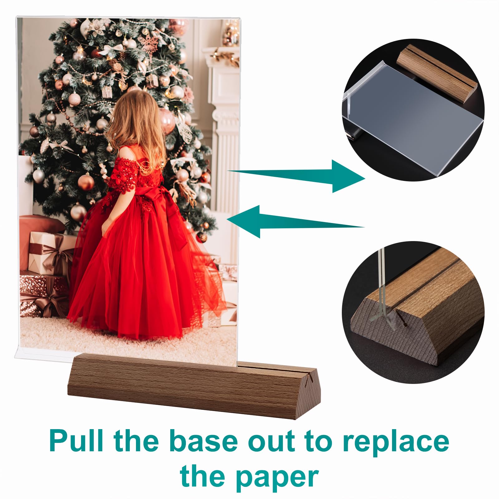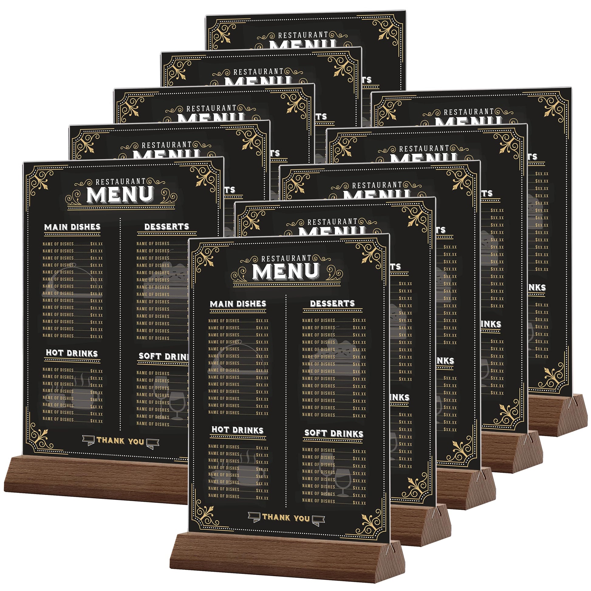 ["Dimension"] The package includes 10 pieces of acrylic table holders, in A5 size, each table stand measures approximately 24 cm/9.45 inches in height, about 15 cm/5.9 inches in length. With wooden base, looks classic and supports your table sign holder stably on any flat surface.