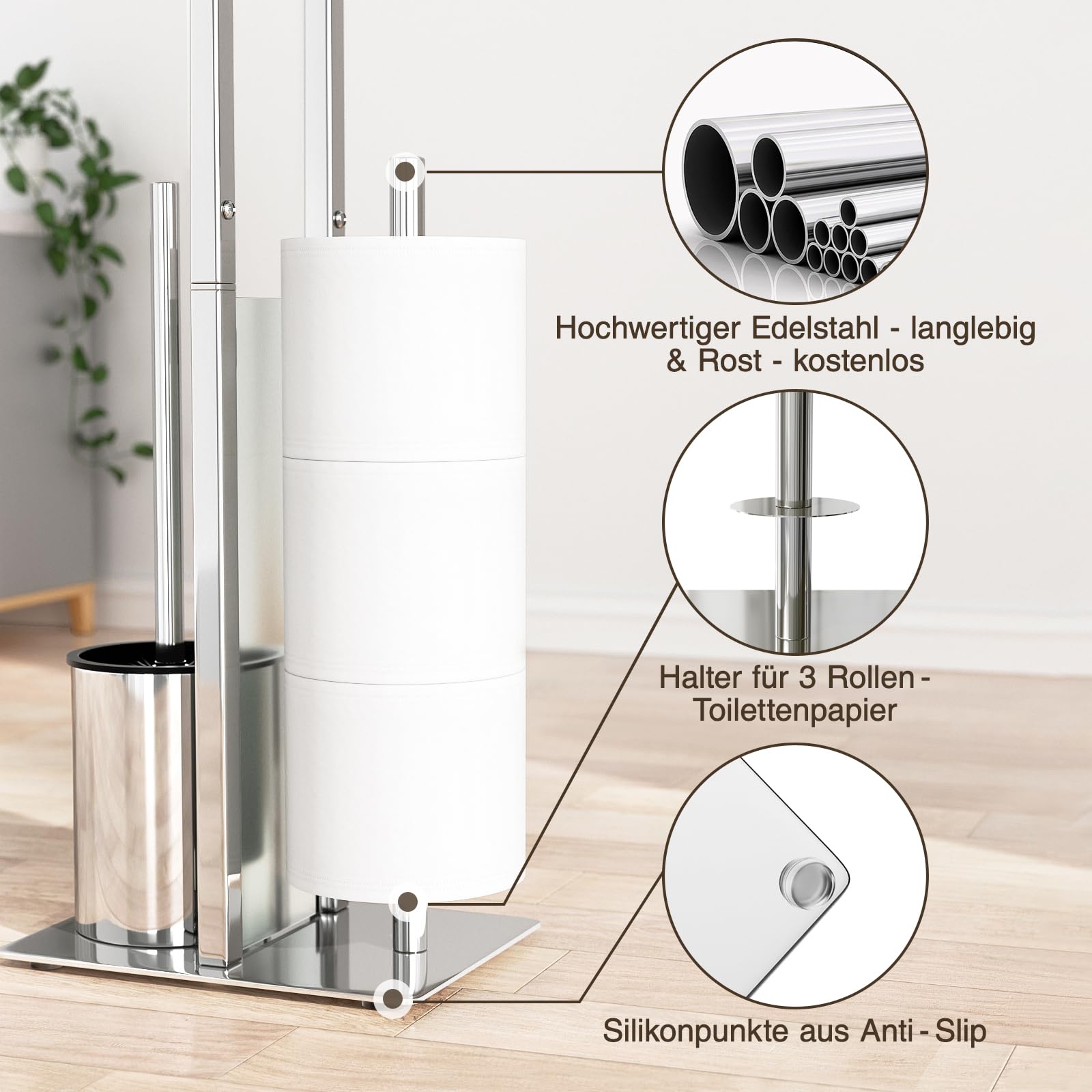Stainless Steel Freestanding Toilet Paper Holder with Toilet Brush - Toilet Paper Holder with Tray, Toilet Paper Holder with Toilet Brush, Toilet Roll Holder with Glass Shelf (Silver)