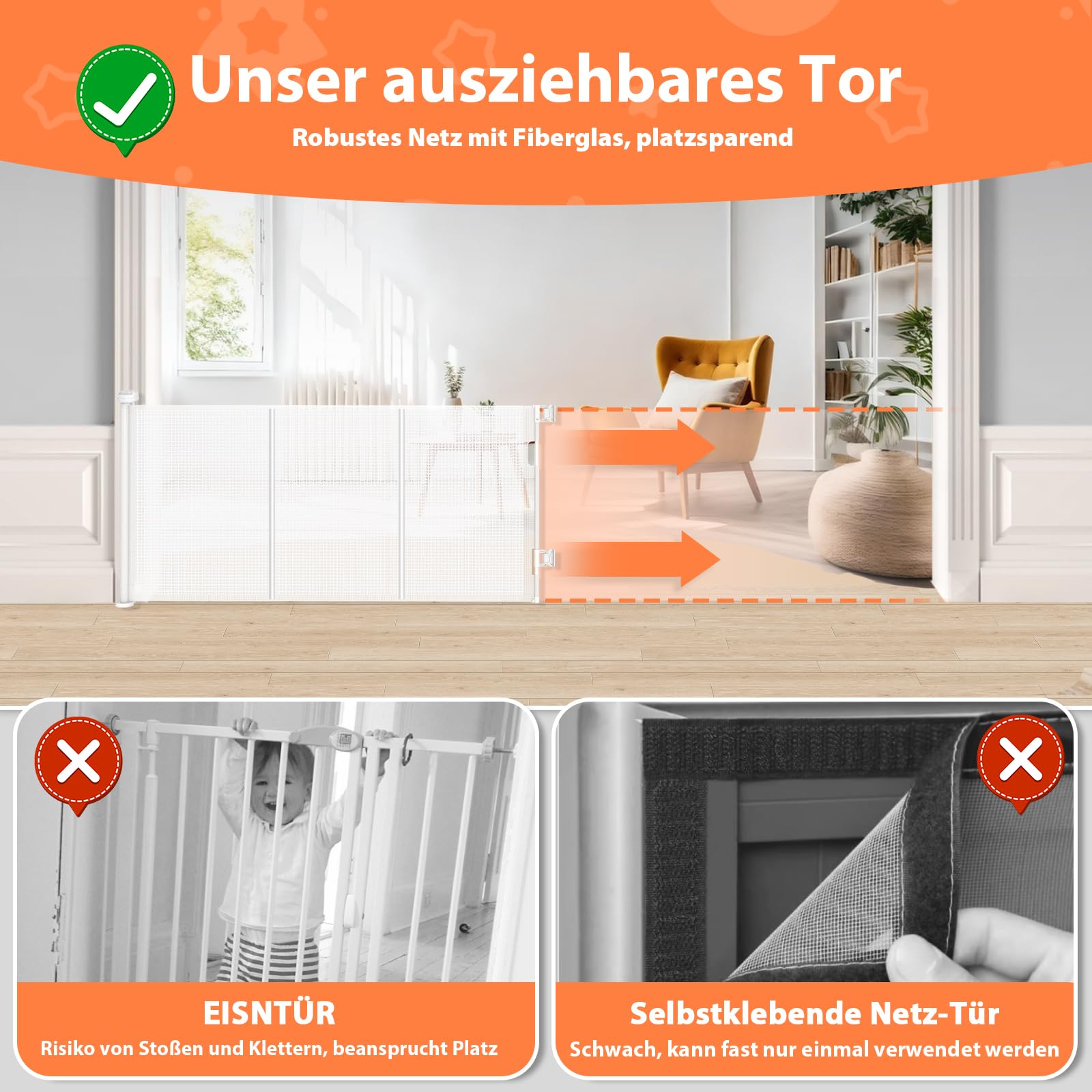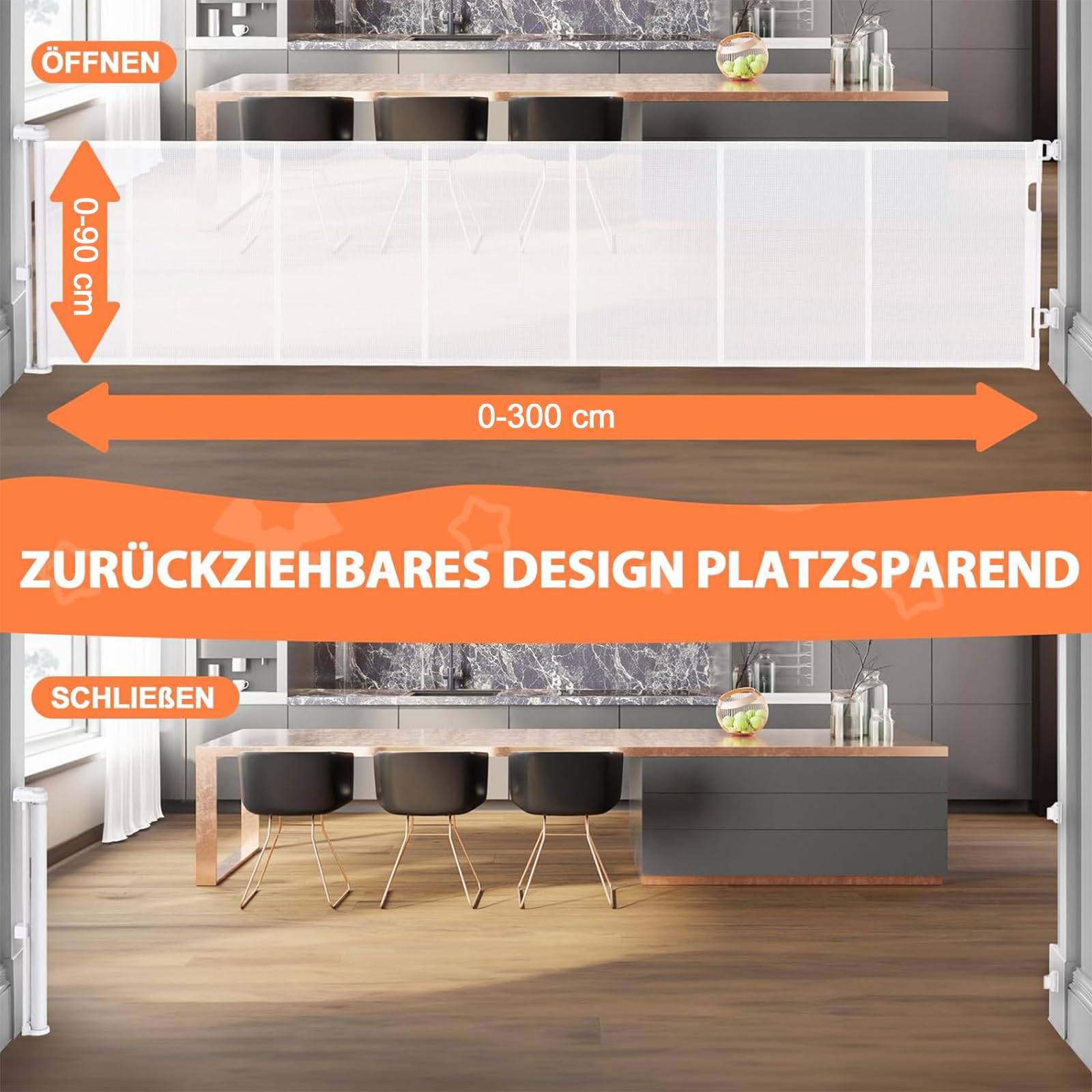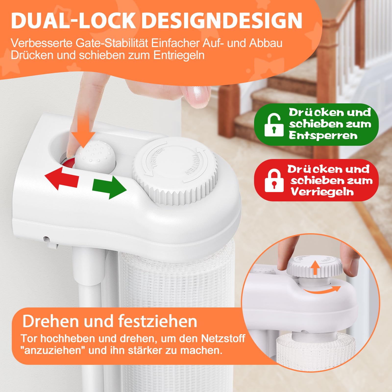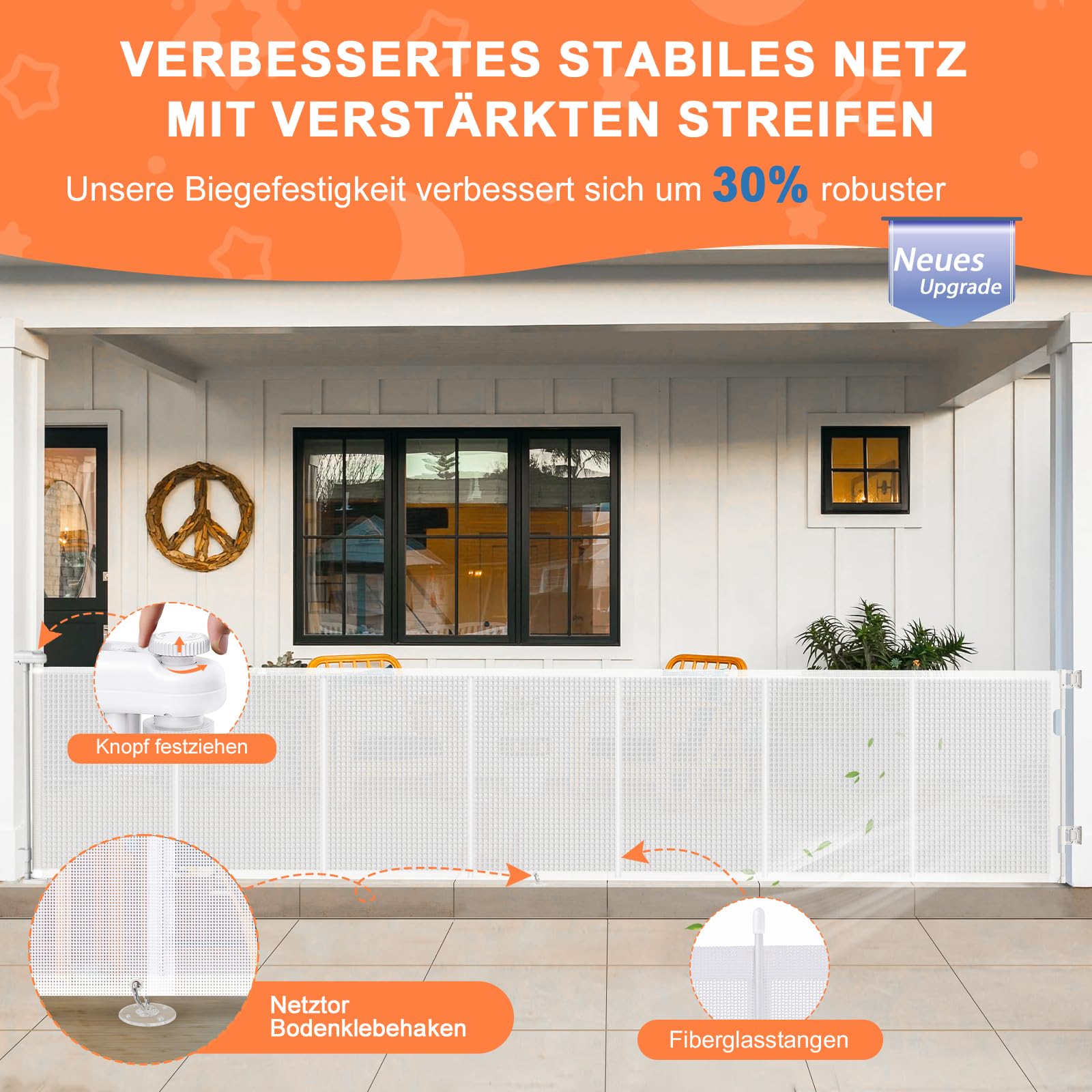 ["Upgraded Retractable Stair Gate】The upgraded reinforced dog gate features 6 fiberglass-reinforced rods (1 fiberglass rod every 18.7 inches), making the baby safety gate stronger and less prone to deformations. It prevents the top gate from sagging, deforming, and the bottom from lifting. This retractable mesh gate comes with a floor adhesive hook for optional use. Double reinforcement prevents babies and pets from going under the gate.","【Improved Lock】① The retractable gate features a new "LOCK" switch. Lift it up and turn it to the right to tension the door. ② There is a locking device on top. Push and slide the button until it shows 'Green' to unlock, allowing you to open the door or quickly retract. 'Red' means it is locked, and the gate cannot be opened, but the gate can be slowed down and retracted.","【300cm Extra Wide Stair Gate】The retractable dog gate is extra wide, extending up to 300\" in width and 89\" in height. It can be adjusted from 0 to 150\", with a maximum ground clearance of 1 inch. It can adapt to your opening requirements. The retractable dog gate can be fully retracted when not in use, saving space and being more convenient to use than traditional iron and wooden gates.","【Customizable to Any Baseboard】- The lower mounting bracket of the dog gate can be adjusted to accommodate the height of the baseboard, allowing it to fit any baseboard. This makes it safer, more practical, and easier to install. Unlike other doors, this new retractable baby gate has no railings at the bottom, eliminating tripping hazards while walking through. The one-handed operation allows you to open and close it while holding your child.","【Easy Installation】- The retractable gate can be installed at the top and bottom of stairs, doors, hallways, indoors and outdoors. What you get: Mesh baby gate x 1, brackets x 2, latches x 2, wall anchors x 8, screws x 8, mesh gate floor adhesive hook x 1, instructions x 2. With the included tools, you can install a new and secure child gate in minutes. (Requires drilling holes)"]