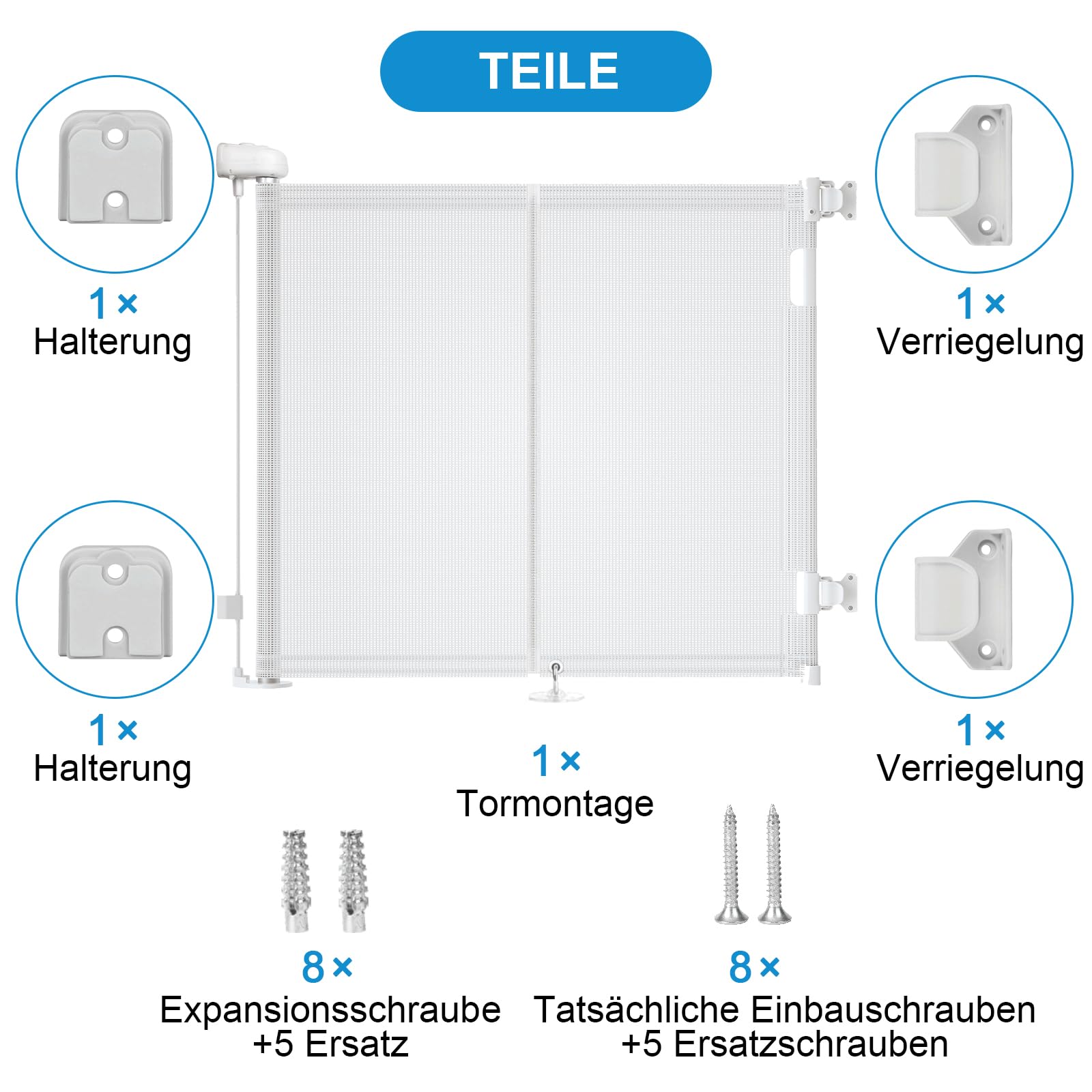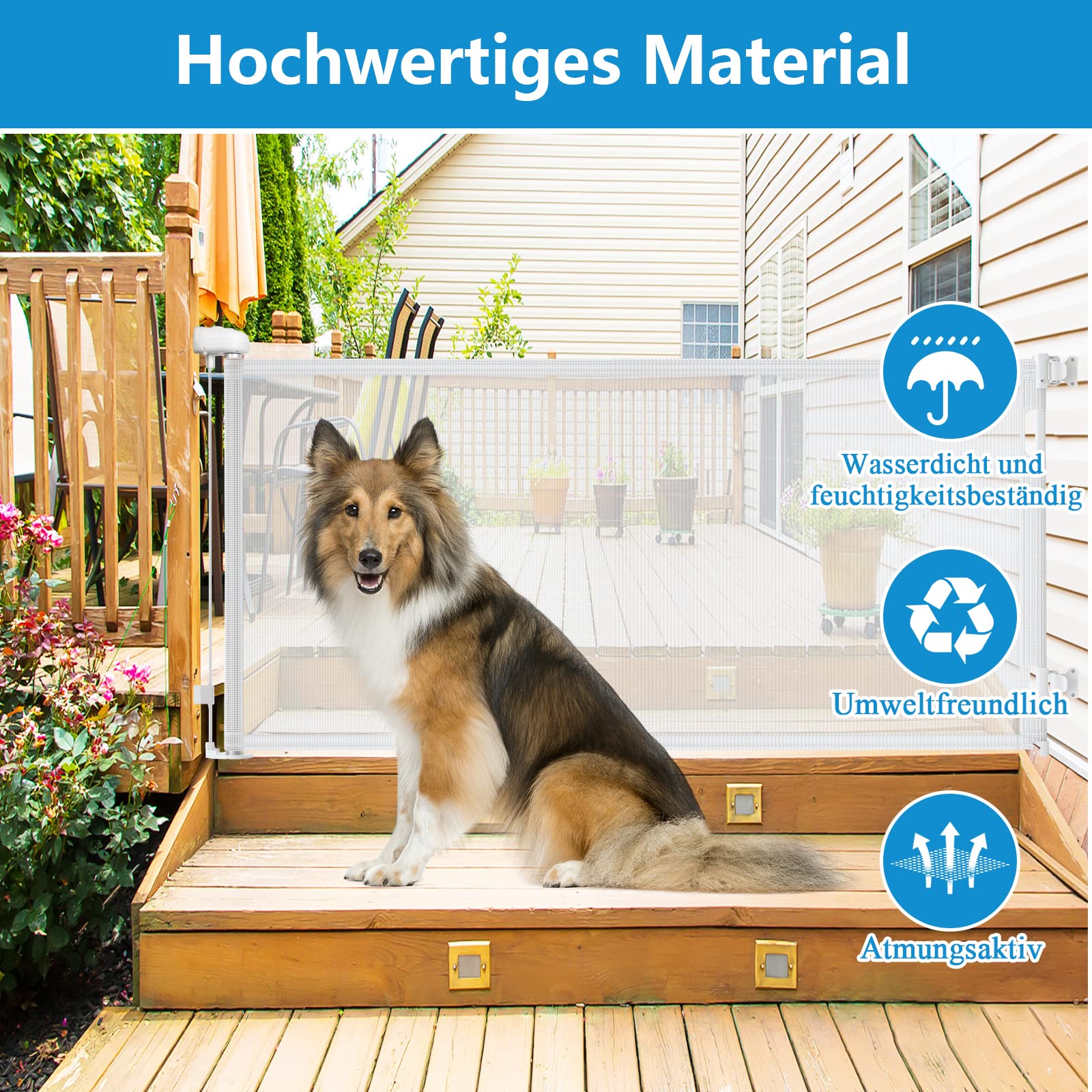 ["Extra wide and retractable baby gate: This extra wide and extra tall baby gate for outdoor use extends up to 150 cm wide and is 86 cm tall, suitable for many indoor and outdoor places. If you choose this extra wide gate, you don't have to worry about it taking up space when your baby or pets are not at home. The mesh lining can be rolled up directly, saving space.","Provides protection for children and pets - perfect for babies from 6 ~ 24 months, versatile protection for home, allowing for easy use in high traffic areas. Hout the Trouel can be unfolded. For pets weighing 10 to 40 kg","One-handed retractable door, easy to lock and open. One-handed operation allows for easy opening and closing in 2 steps: 1. Press the button, turn and release; 2. Pull the, to remove the door. When released, the door automatically blocks the baby's unlocking mechanism. and small and medium-sized dogs. Effective for your safety","Durable structure for safe use and locking function. This gate is designed with a strong and soft mesh to prevent the baby from getting hurt if accidentally hit against the door, and the childproof locking mechanism provides the extra security all parents are looking for. All parts are non-toxic, odorless","Safety gate for indoor and outdoor use, retractable, suitable for all doors and stairs, perfect for staircase bottoms, doors, patios, hallways, decks, railings, indoor and outdoor areas. No more tripping hazards on the metal bars of a traditionally walkable metal gate. Please buy with confidence. Let us know if you have any questions about using our products"]