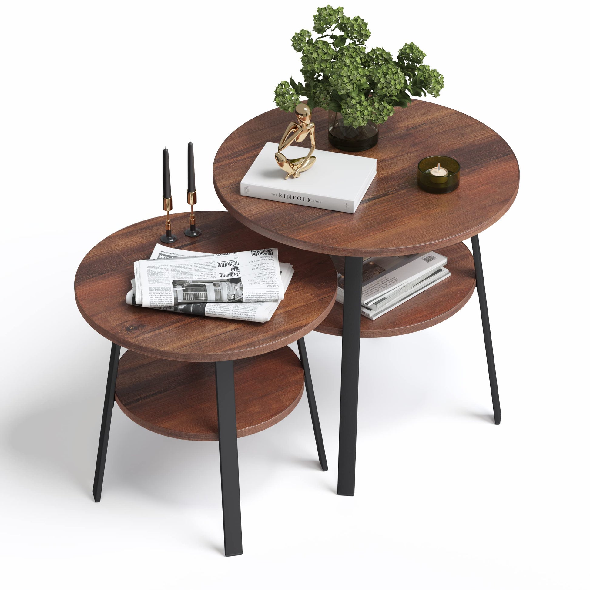 stardis side table round stable metal frame/wood Ø43xH 44 cm, 2 shelves bedside table coffee table for living room bedroom, walnut finish