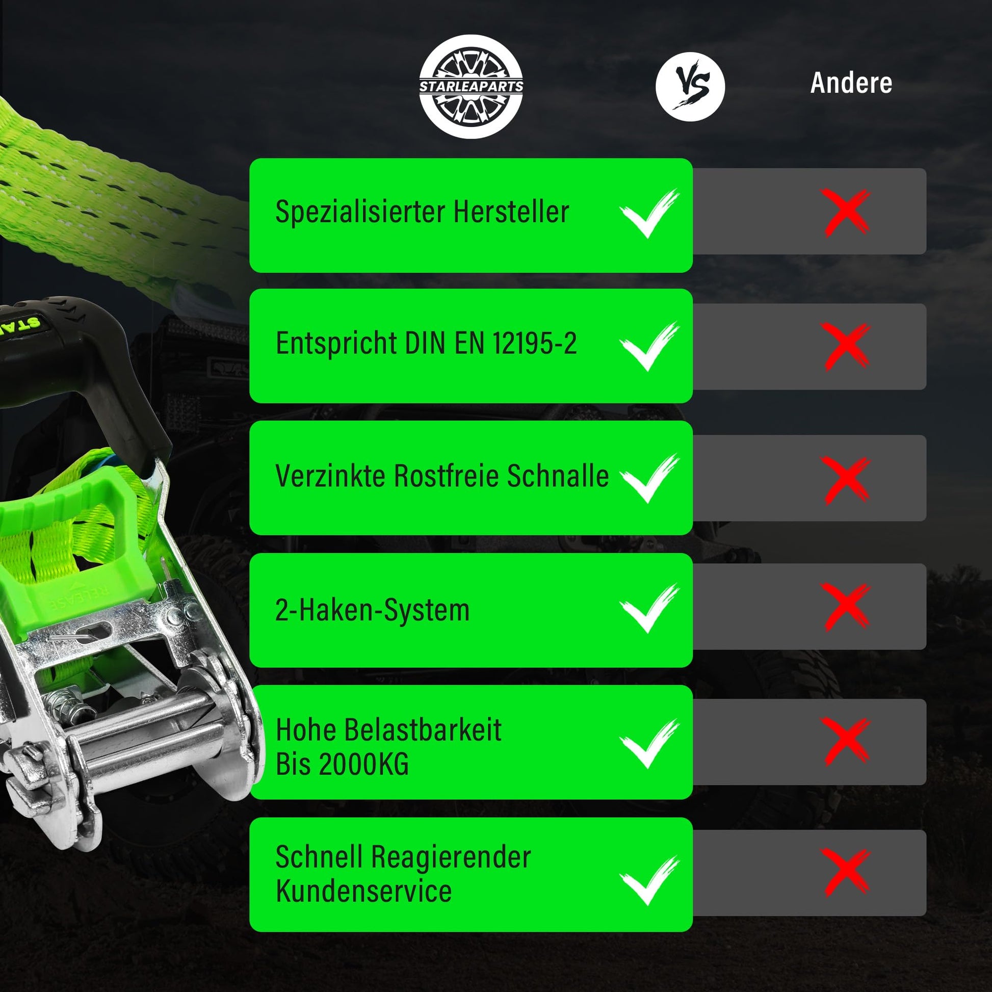 StarLeaparts 2-piece set ratchet tie-down straps, 6m x 35mm. Professional two-piece wheel straps, rated up to 2000kg. Ratcheting straps for car transport vehicle wheel security, Green.