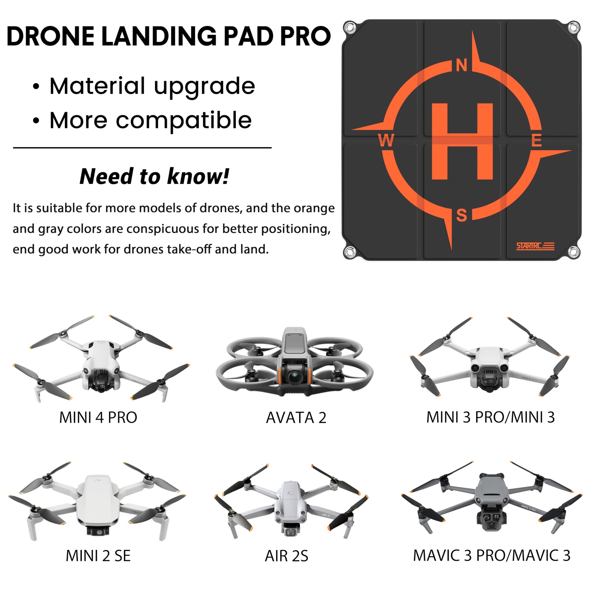 ["【Universal Drone Landing Pad】STARTRC Foldable Drone landing pad can be used for DJI Neo/Avata 2/Mini 4 Pro/Air 3/Mavic 3 Pro/Mini 3 Pro/Mini 2 SE/Air 3S /Mavic Mini 2/Mavic Air 2/Mavic 2 Pro/Zoom/Mavic Pro/DJI FPV/Holy Stone in any environment as the perfect take-off and landing area.","【Functional & Portable】55 x 55cm (22" x 22") size, easily foldable for you to take it anywhere. Help your drone to easily find the take-off position, strong enough to use on sand, grass, rough terrain, or snow.","【Premium waterproof material】STARTRC Landing Pad is made of high-quality waterproof PU PVC material, lightweight and dirt-resistant. It only takes a bottle of water to refresh the landing platform.","【Perfect Design】Double-sided color design (Gray-Orange) with highlighted landing area; Easy to fold and quick to store; Comes with a waterproof storage bag for easy outdoor storage and transport.","【Package includes】1x Drone Landing Pad (22"), 1x Waterproof Storage Bag."]