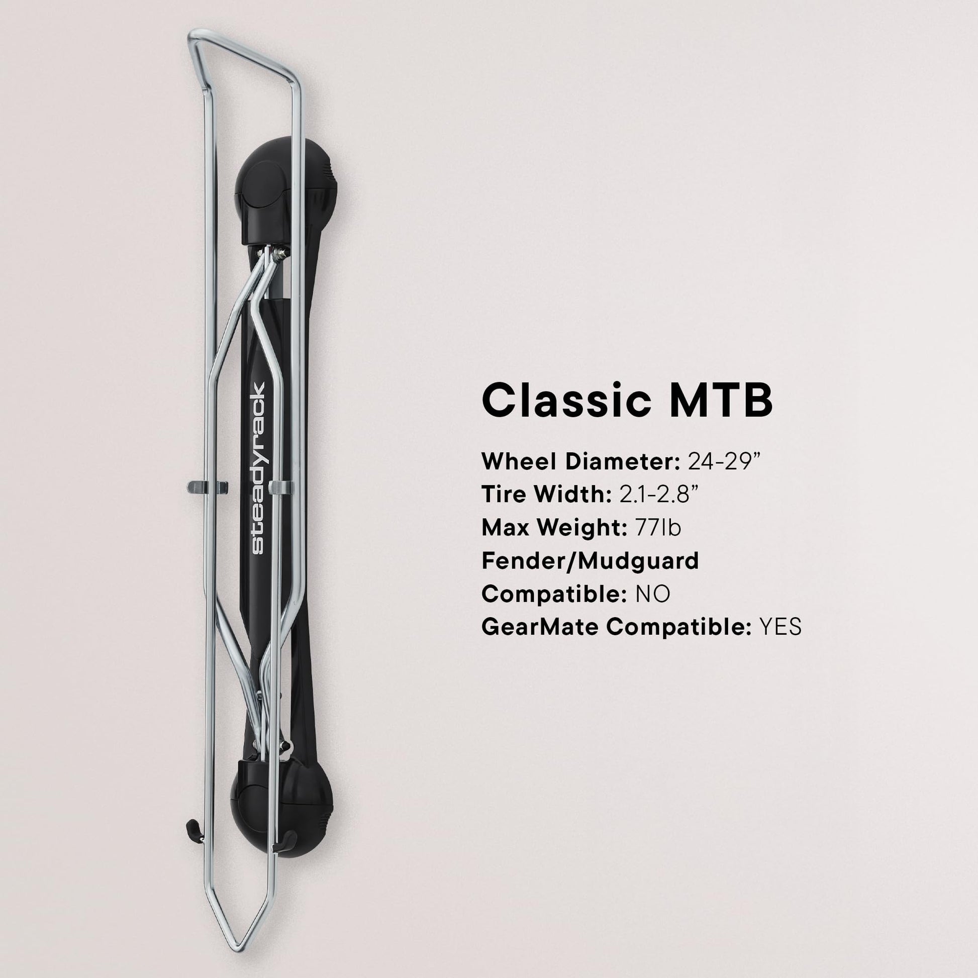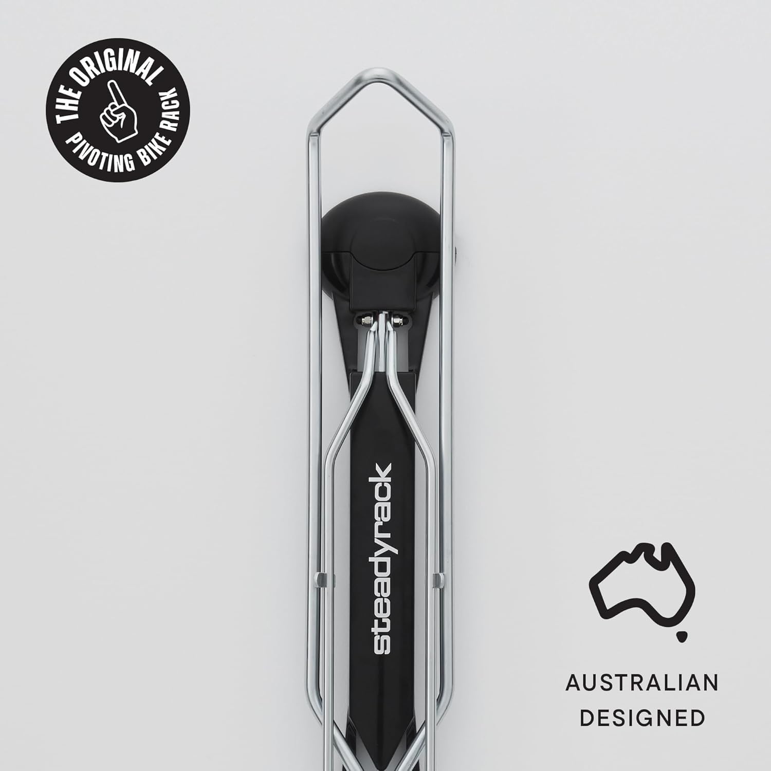 ["Durable - Our bike rack is made of steel and UV-treated plastic. This makes our bike holder sturdy and durable, holding up to 35 kg.","No Heavy Lifting - Simply balance the bike on the rear wheel and slide it into the bike storage - no heavy lifting required.","Space-Saving - Unlike bike stands, bike hooks, or pulley bike hangers, our bike racks have a unique 160-degree swivel function.","Splash Guard/Fender? - If your bike has a splash guard or fender, this bike wall mount is not suitable for your bike. Instead, check out our Steadyrack E-Bike bike rack wall mount!","Specifications: 2.1 to 2.8-inch maximum tire width, 20 to 29-inch recommended wheel diameter (including tire)."]